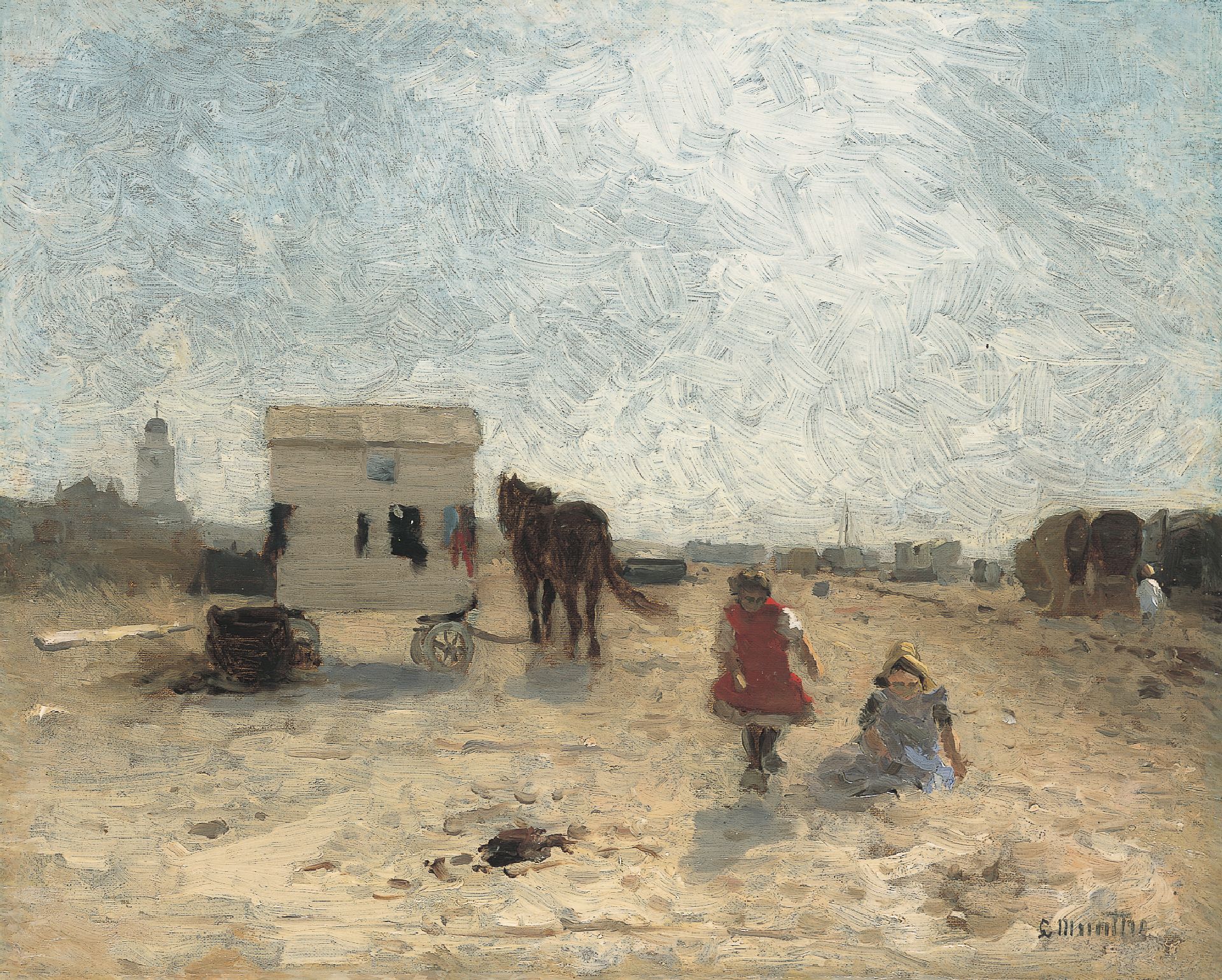 Ludwig Munthe kunstwerk • schilderij • voorheen te koop Kinderen en badkoets op het strand van Katwijk