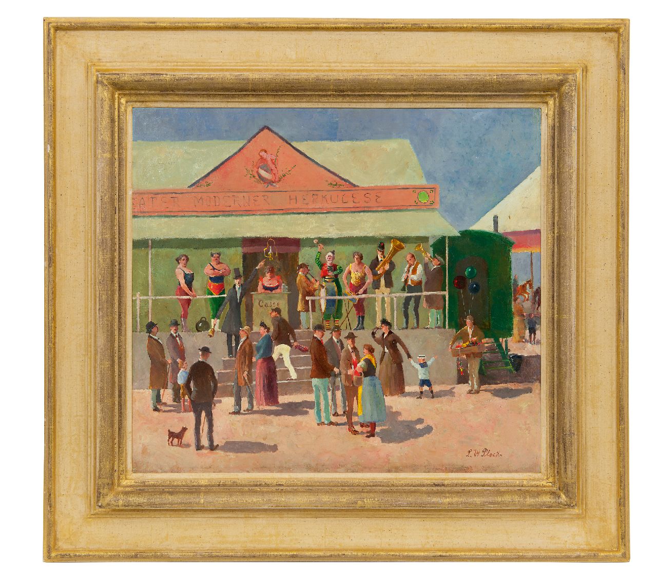 Ludwig Wilhelm Plock kunstwerk • schilderij • voorheen te koop Op de kermis bij de tent van de Sterkste Man