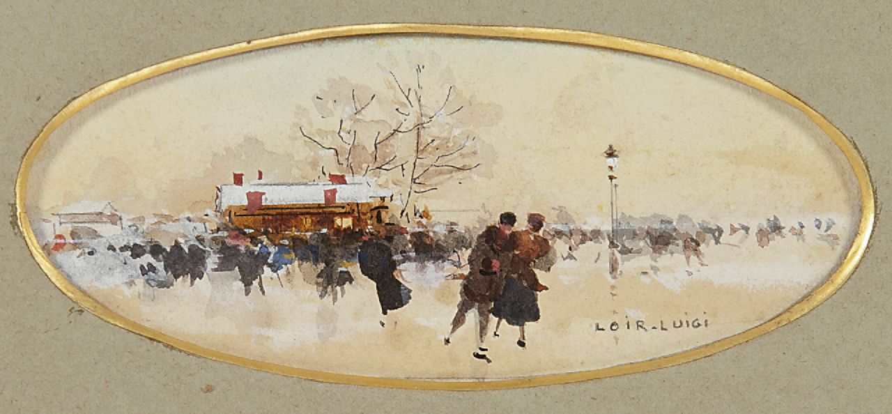 Luigi Loir kunstwerk • aquarel • tekening • voorheen te koop Schaatsers in het Bois de Boulogne