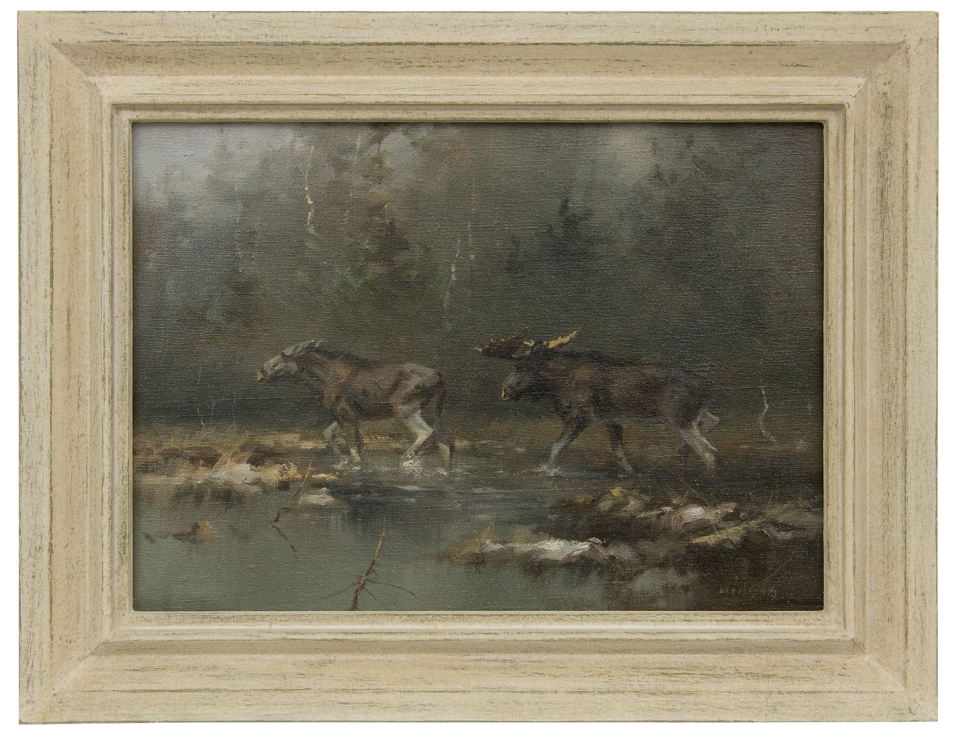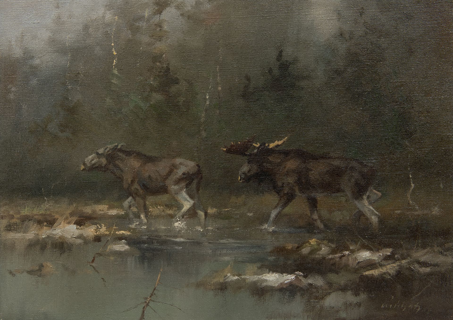 Manfred Schatz kunstwerk • schilderij • te koop Elandenpaar bij een rivier