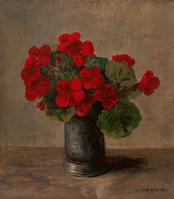 Manus van der Ven | Tinnen vaas met geraniumtakken, olieverf op doek, 32,6 x 29,1 cm, gesigneerd r.o. en zonder lijst