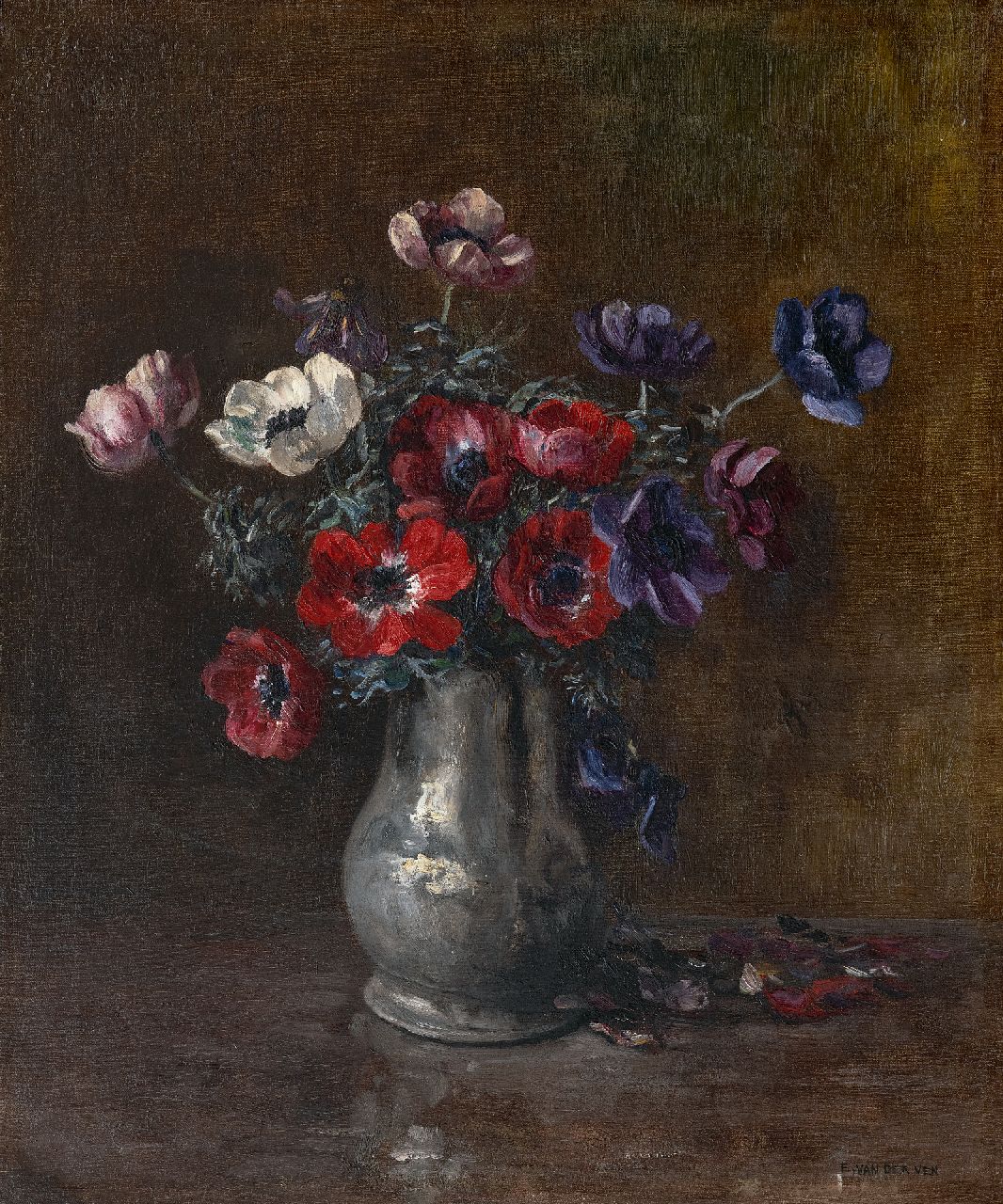 Manus van der Ven kunstwerk • schilderij • te koop Tinnen vaas met anemonen