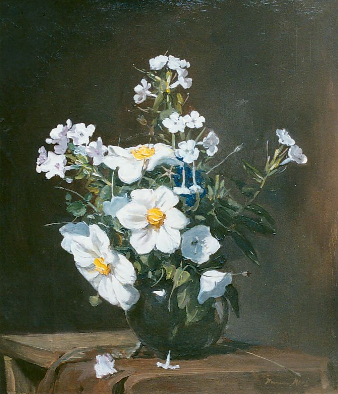Margaretha Agatha Mees kunstwerk • schilderij • voorheen te koop Wit boeket met floxen, margrieten en klaprozen