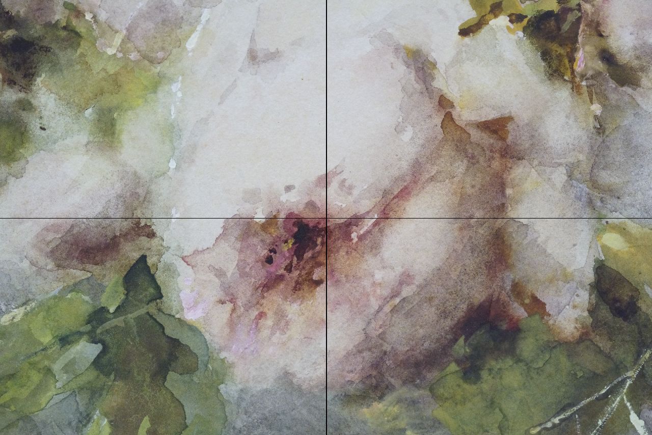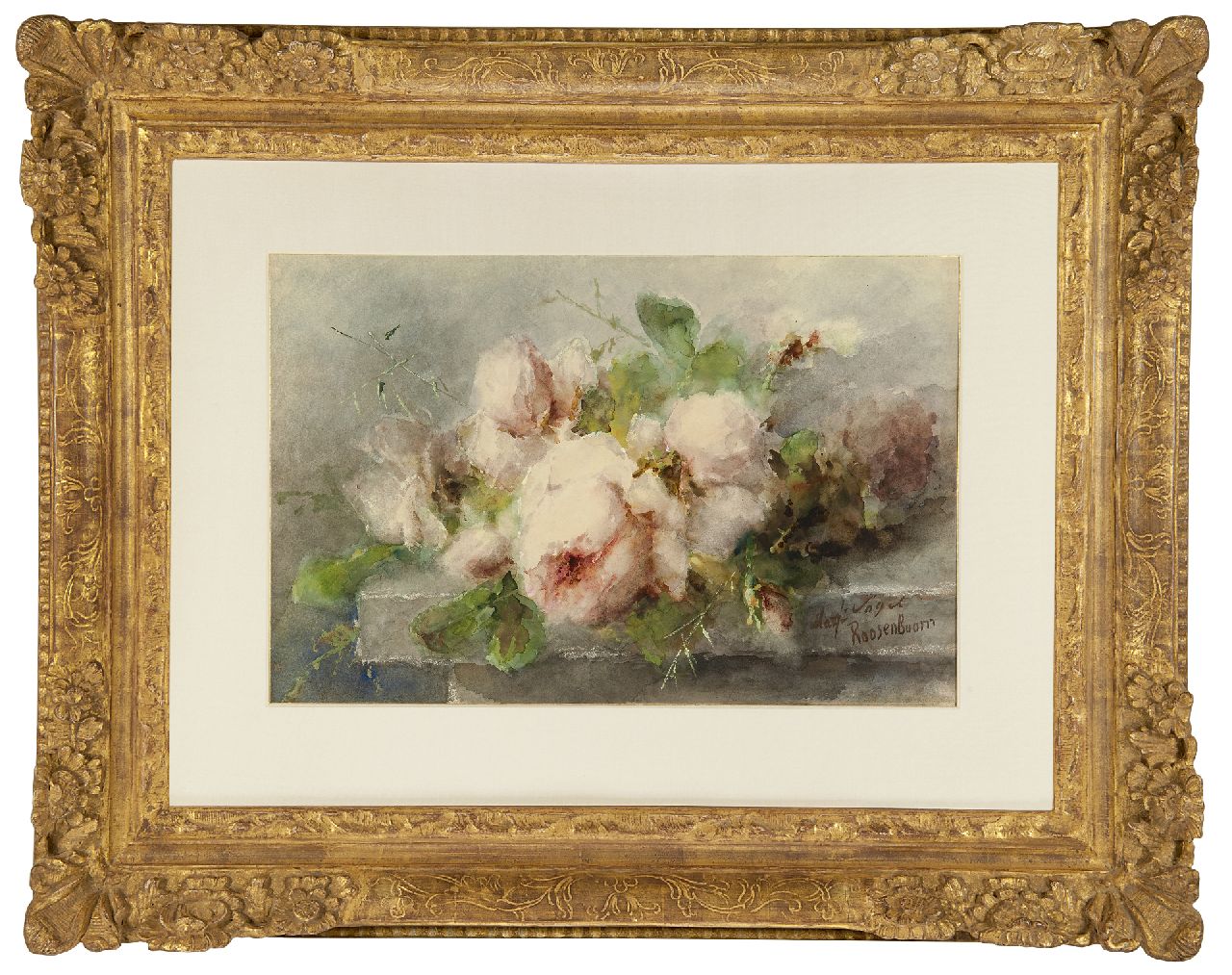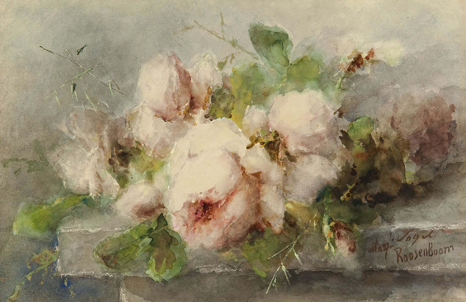 Margaretha Roosenboom kunstwerk • aquarel • tekening • te koop Roze rozen op stenen plint