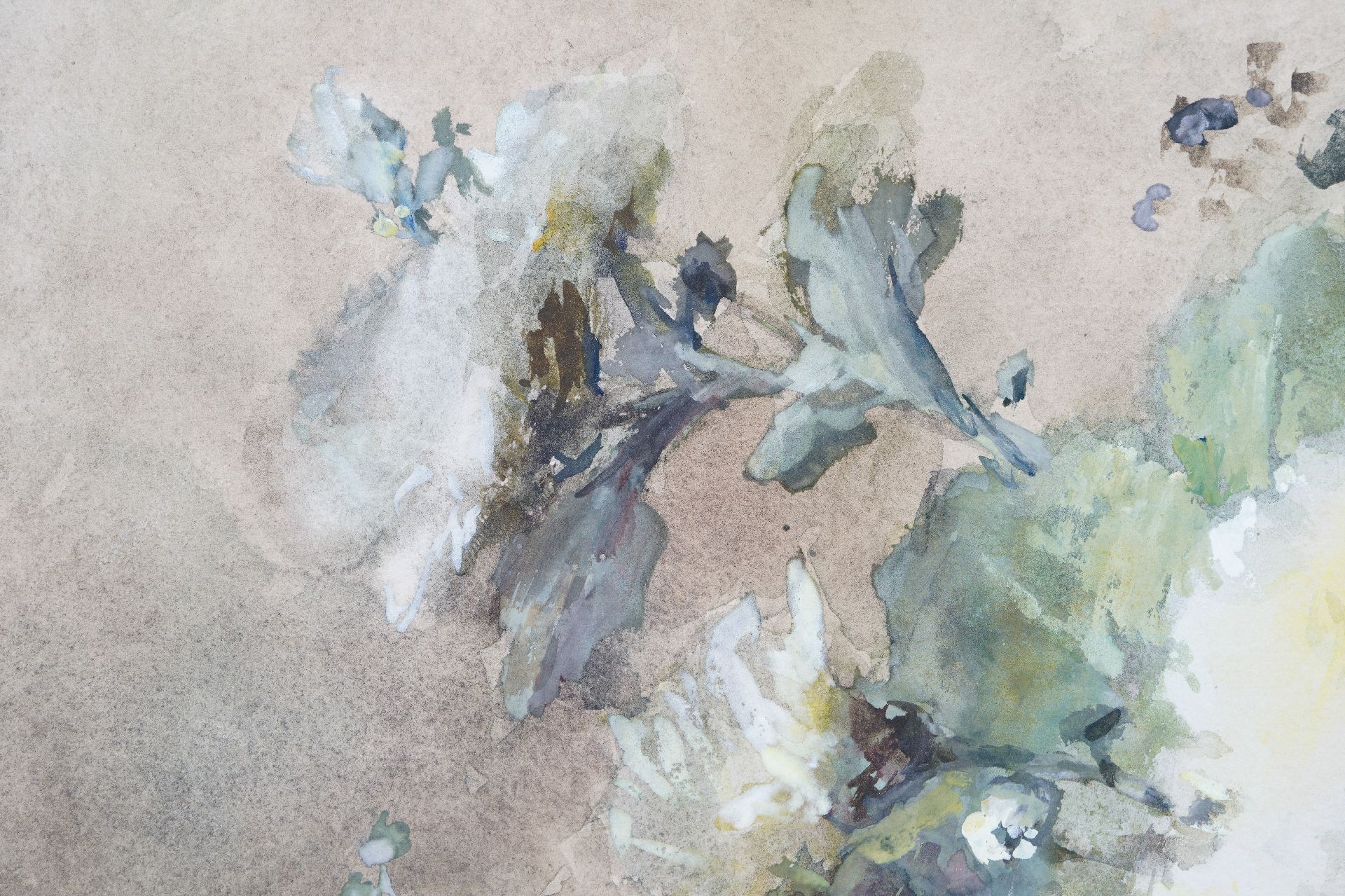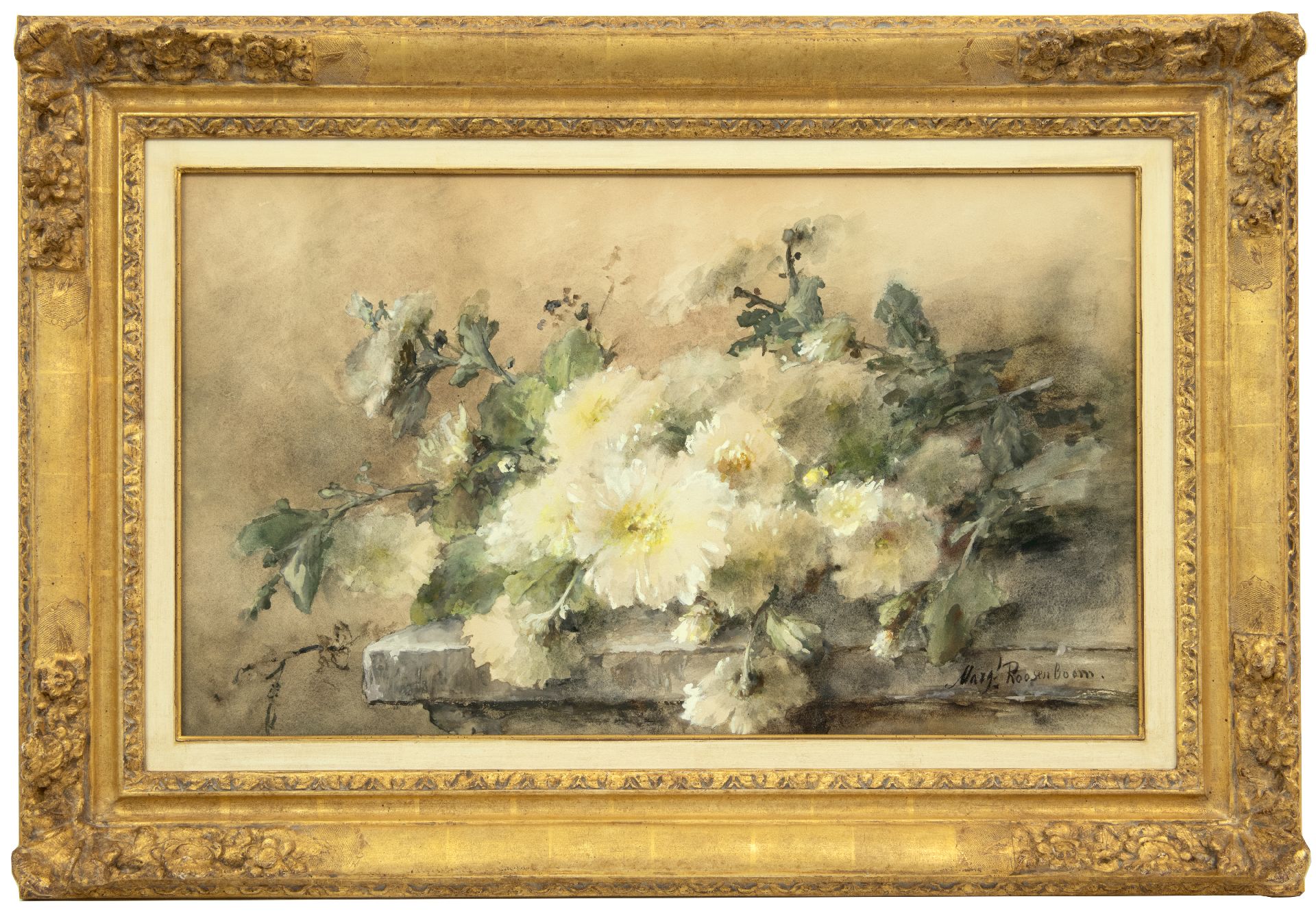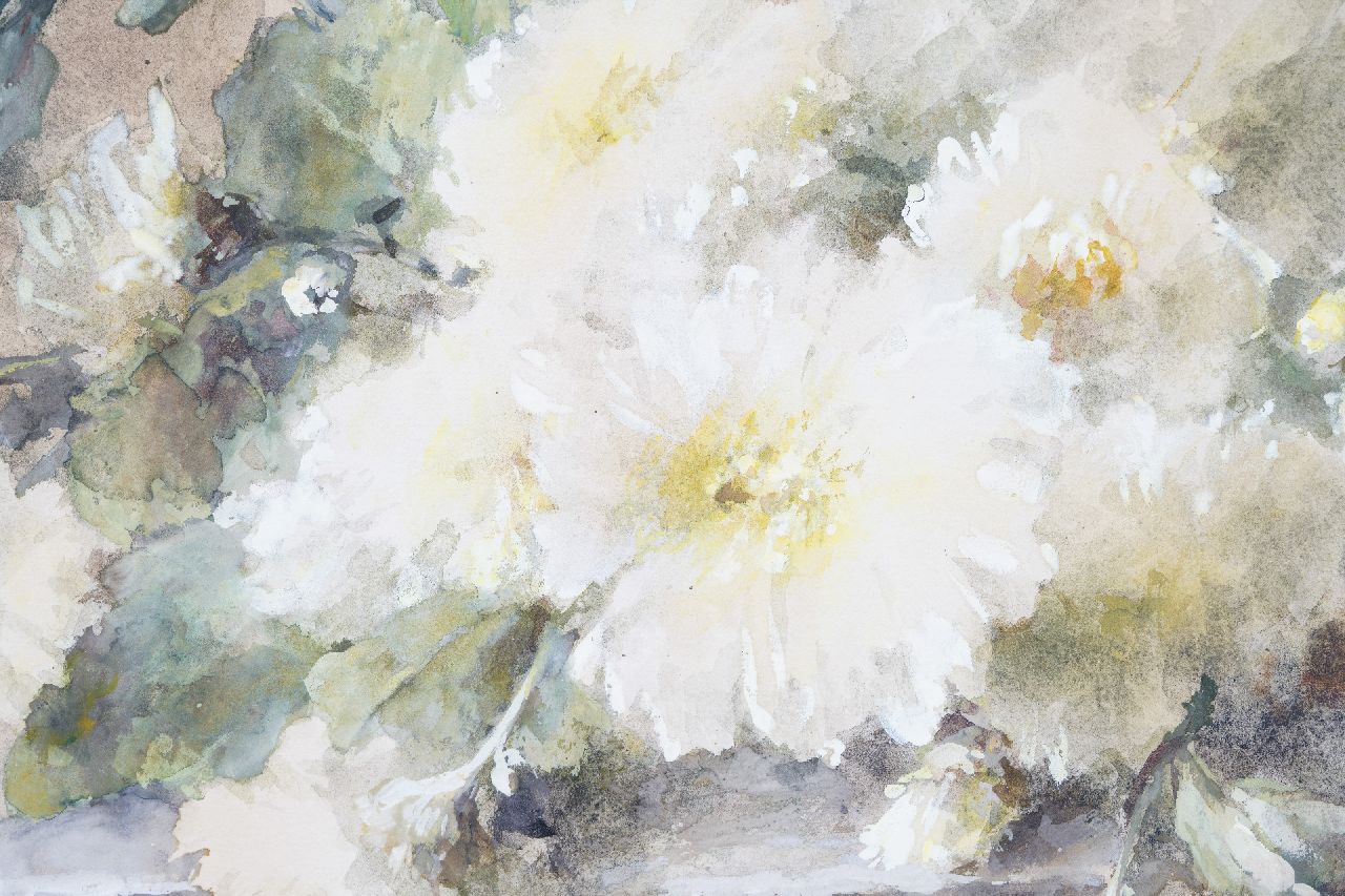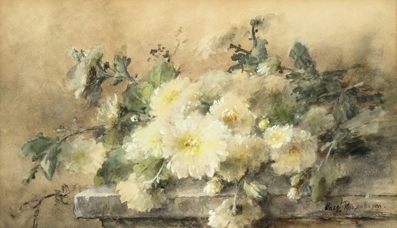 Margaretha Roosenboom kunstwerk • aquarel • tekening • te koop Witte chrysanten op een stenen plint