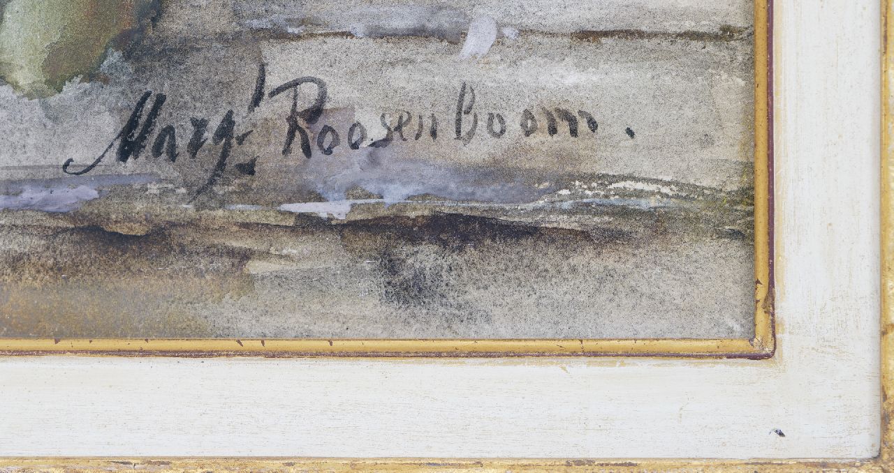 De eerste schilderlessen kreeg Margaretha Roosenboom van haar vader, N.J. Roosenboom, terwijl grootvader Andreas Schelfhout haar de aquareltechniek bijbracht. Het liefst schilderde Margaretha bloemen in hun meest natuurlijke staat, geschikt in vazen of als boeket los neergelegd op de bosgrond. Dat betekent dat in haar stillevens ook wilde en uitgebloeide bloemen voorkomen. Hiermee brak zij bewust met de traditie van het 18e-eeuwse, zorgvuldig geschikte pronkstilleven. Eén bloemsoort - dikwijls rozen - vormt vaak het hoofdmotief van haar schilderijen en aquarellen. Over haar warme tonen en specifieke kleurgebruik schreef een tijdgenoot ‘Vermeer had zijn eigen blauw (…) Rembrandt zijn gulden kleurengamma, Margaretha Roosenboom haar, als roze paarlen glanzende nuanceringen’. Margaretha Roosenboom trouwde in 1892 te Voorburg met de kunstschilder Johannes Gijsbert Vogel.