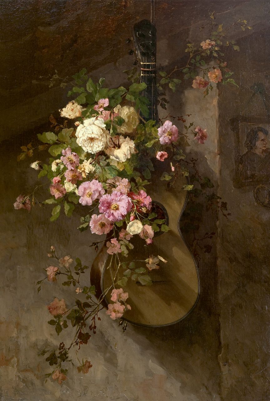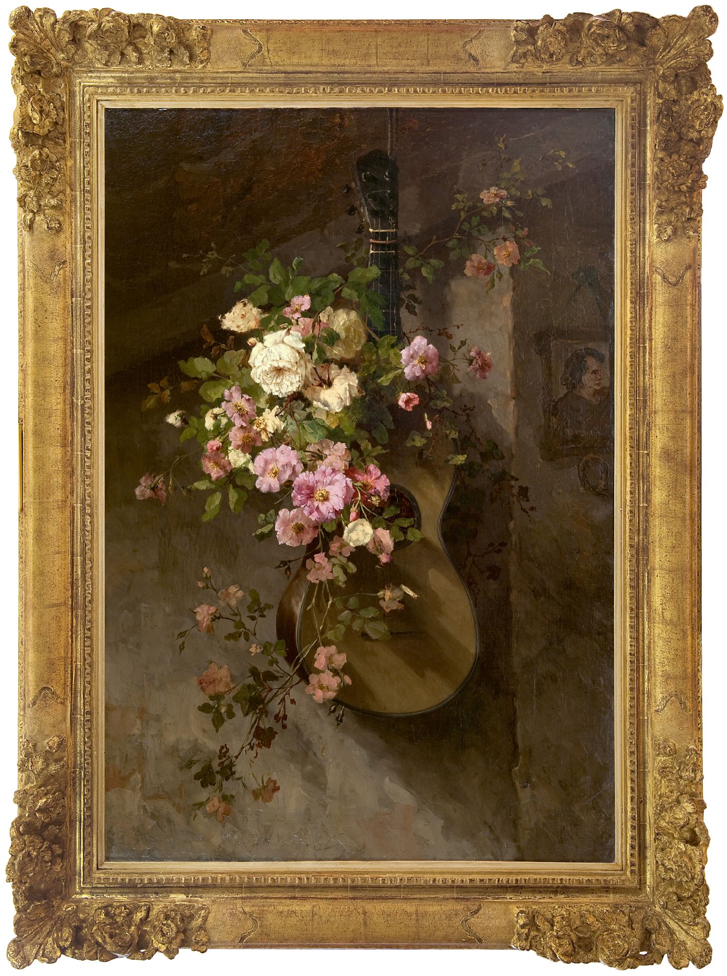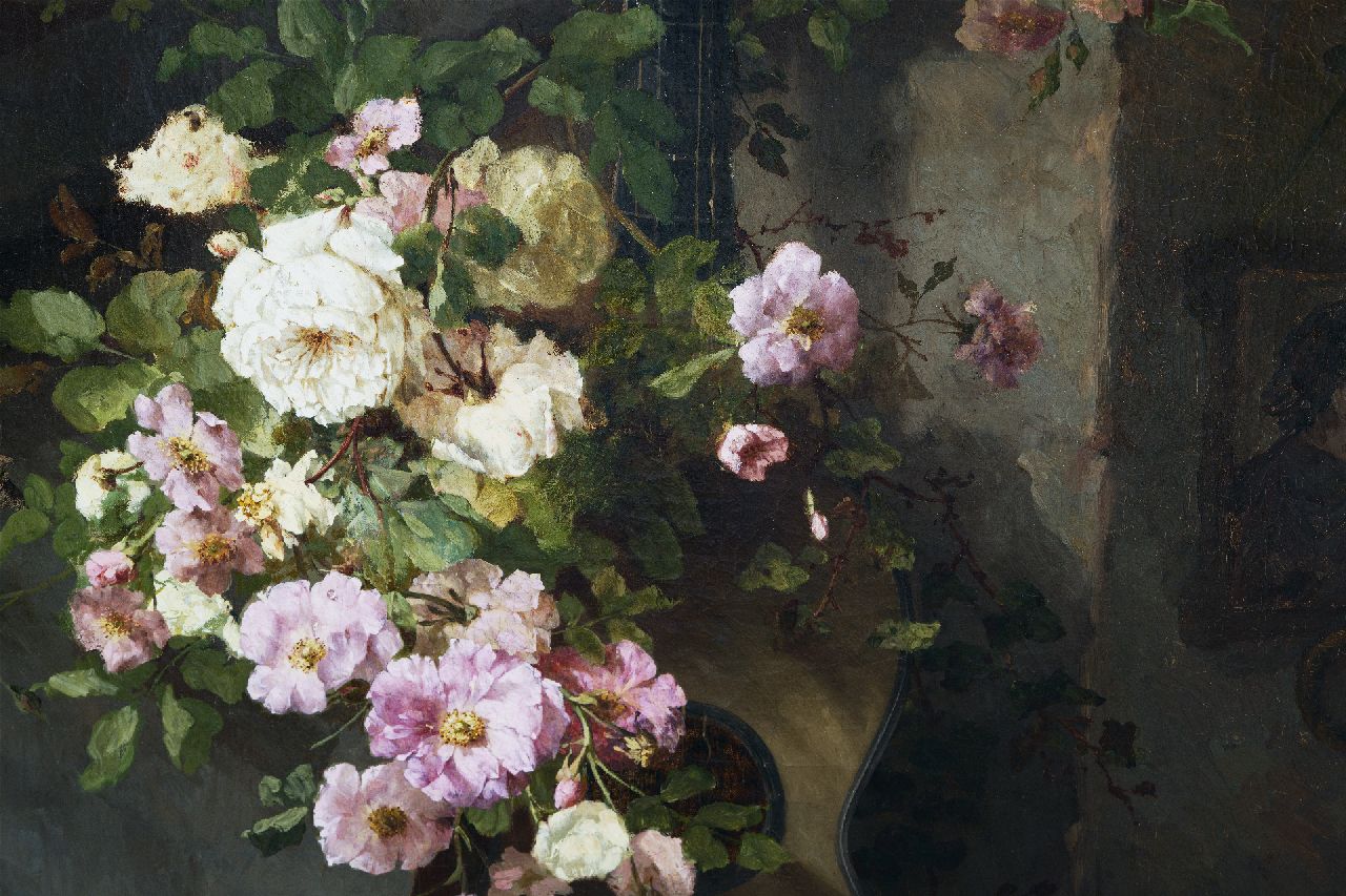 Margaretha Roosenboom, de dochter van Nicolaas Roosenboom, specialiseerde zich in schilderen van bloem- en fruitstillevens en was één van de eerste professionele schilderessen van Nederland. Haar stillevens waren vernieuwend. Ze brak met de traditie van het geordende pronkstilleven en koos voor een spontanere en lossere uitgevoerde weergave van slechts één of enkele soorten bloemen. In dit geval voor klimrozen die zij niet in een vaas plaatst, maar speels tegen een Spaanse gitaar op laat klimmen.