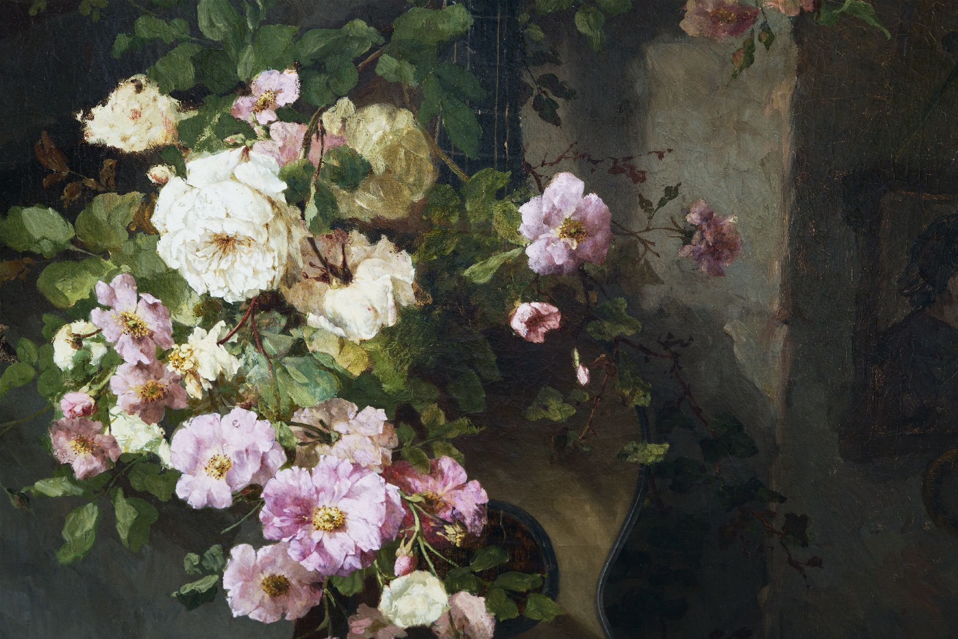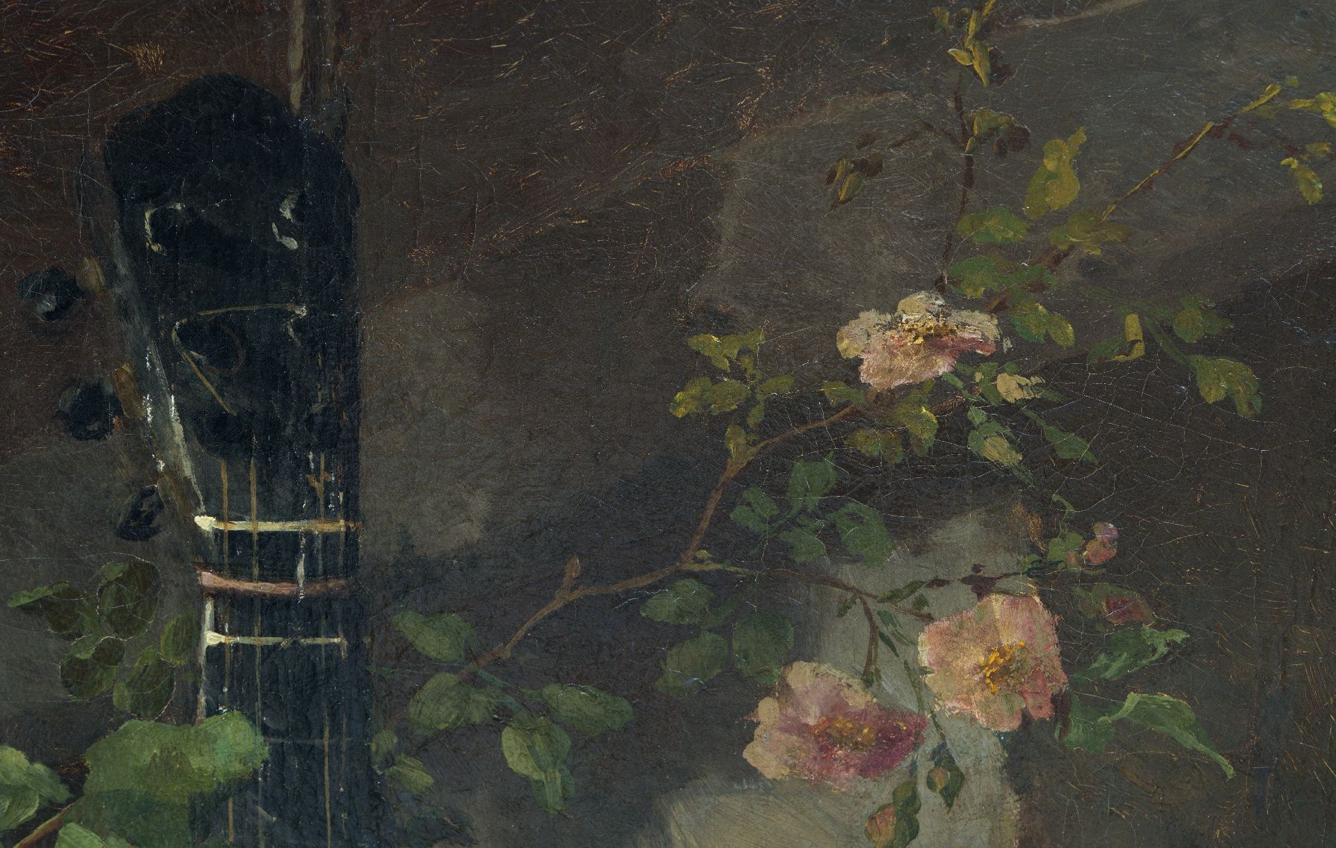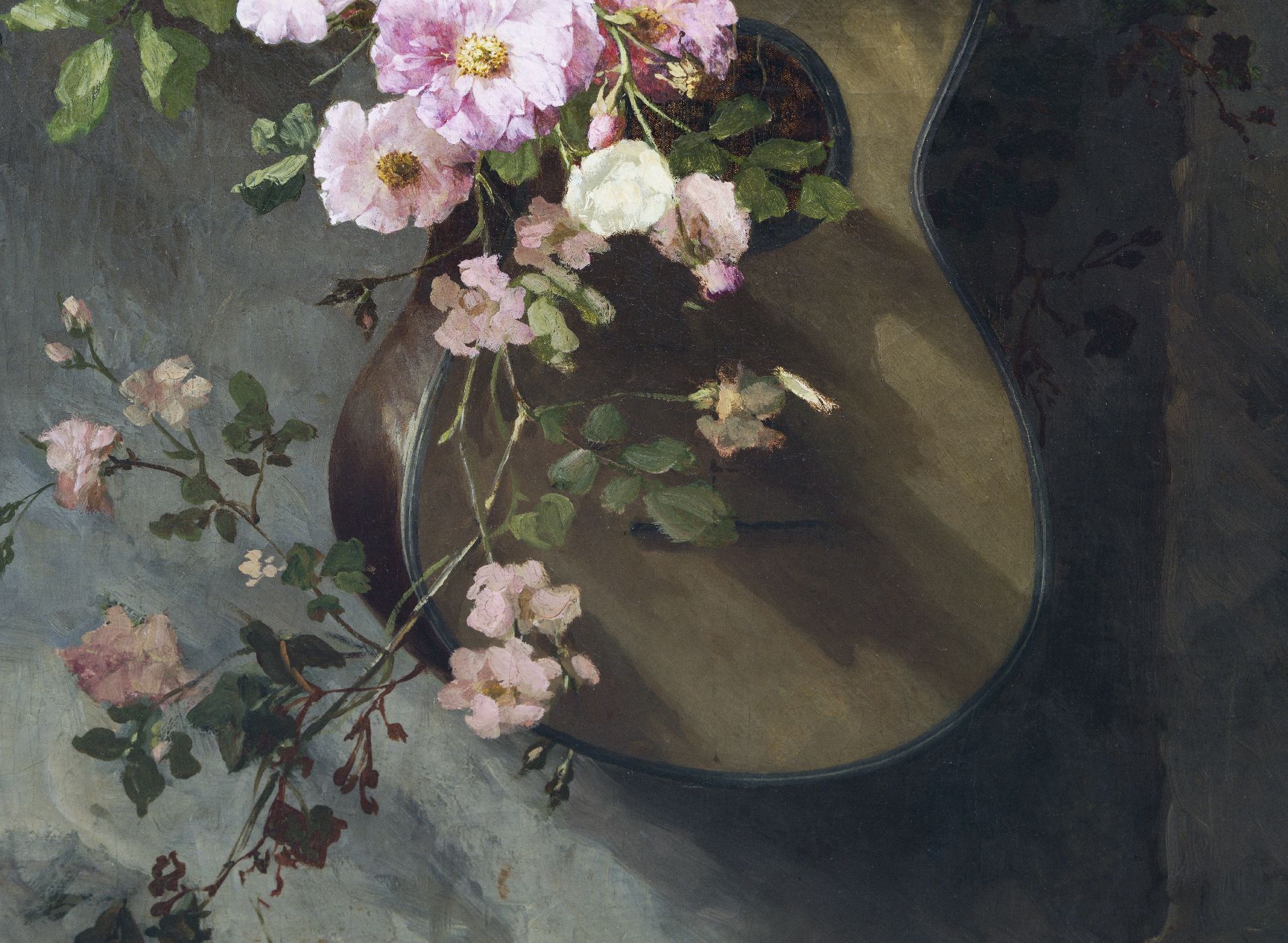 Margaretha Roosenboom, de dochter van Nicolaas Roosenboom, specialiseerde zich in schilderen van bloem- en fruitstillevens en was één van de eerste professionele schilderessen van Nederland. Haar stillevens waren vernieuwend. Ze brak met de traditie van het geordende pronkstilleven en koos voor een spontanere en lossere uitgevoerde weergave van slechts één of enkele soorten bloemen. In dit geval voor klimrozen die zij niet in een vaas plaatst, maar speels tegen een Spaanse gitaar op laat klimmen.