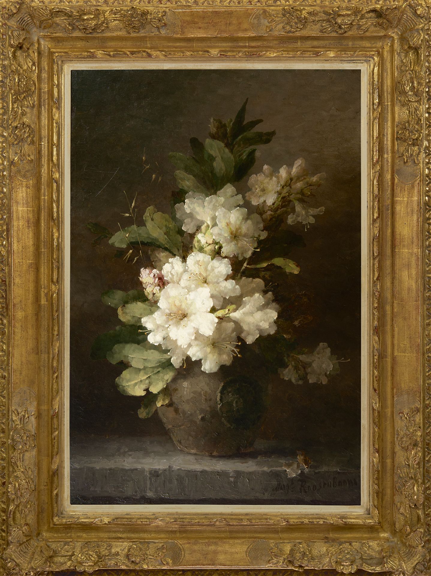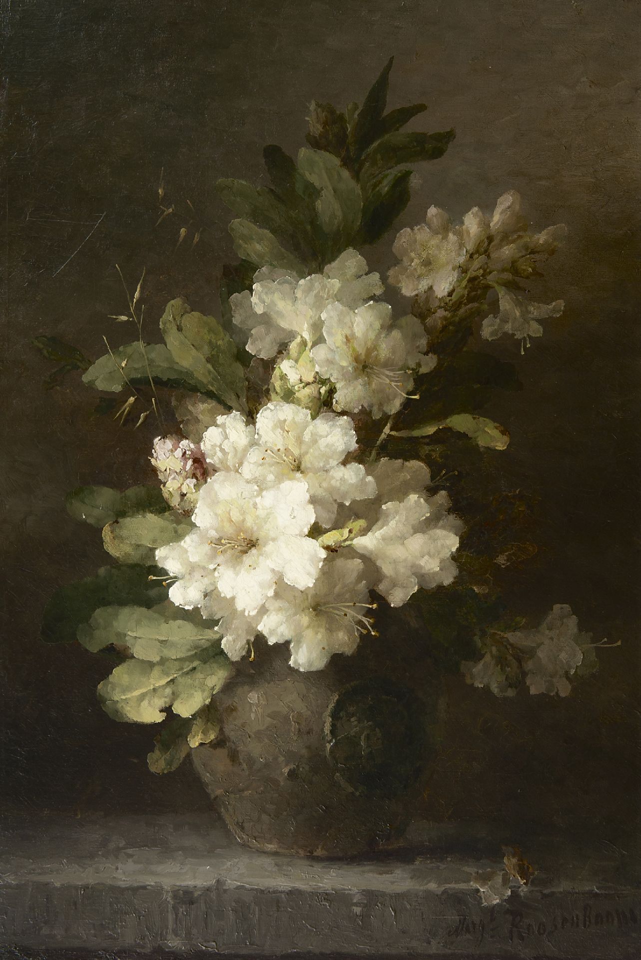 Margaretha Roosenboom kunstwerk • schilderij • voorheen te koop Rododendrontakken in stenen kruik