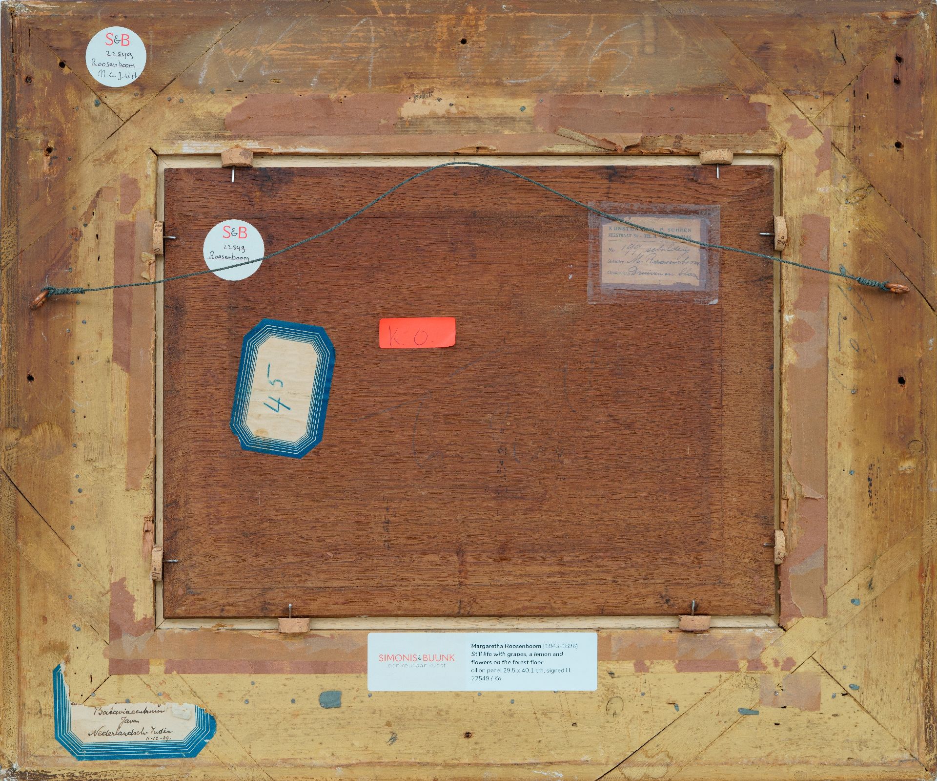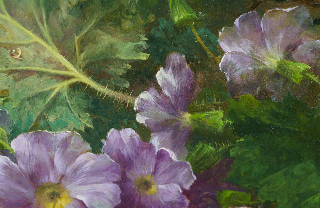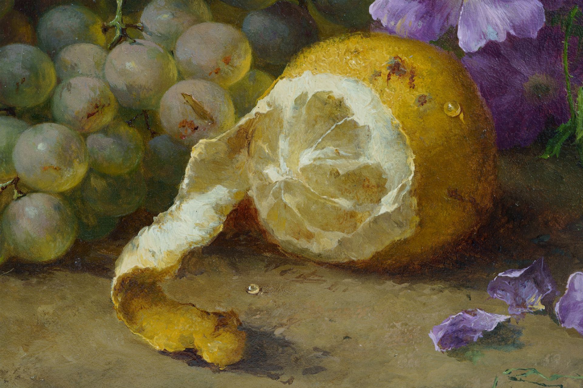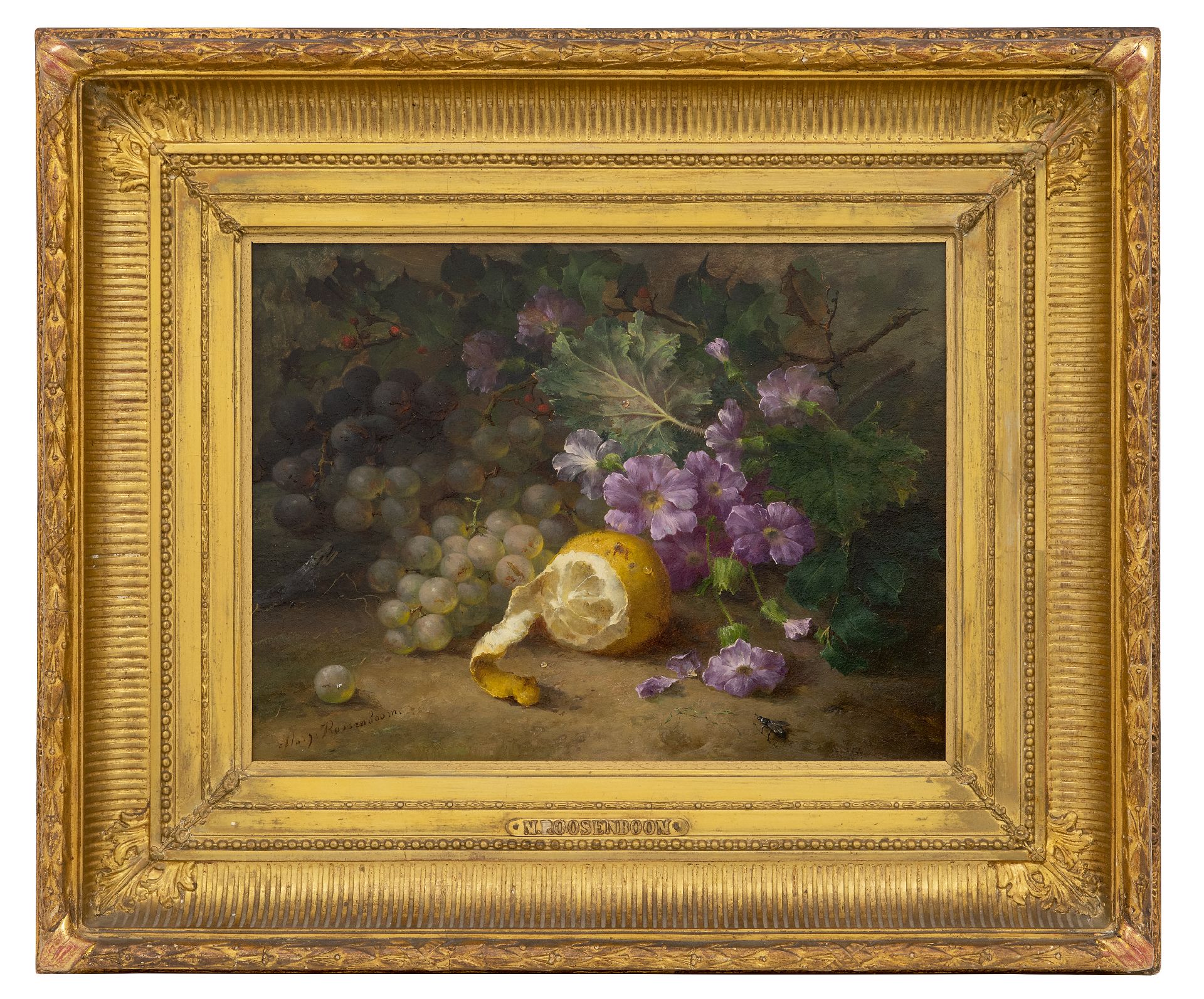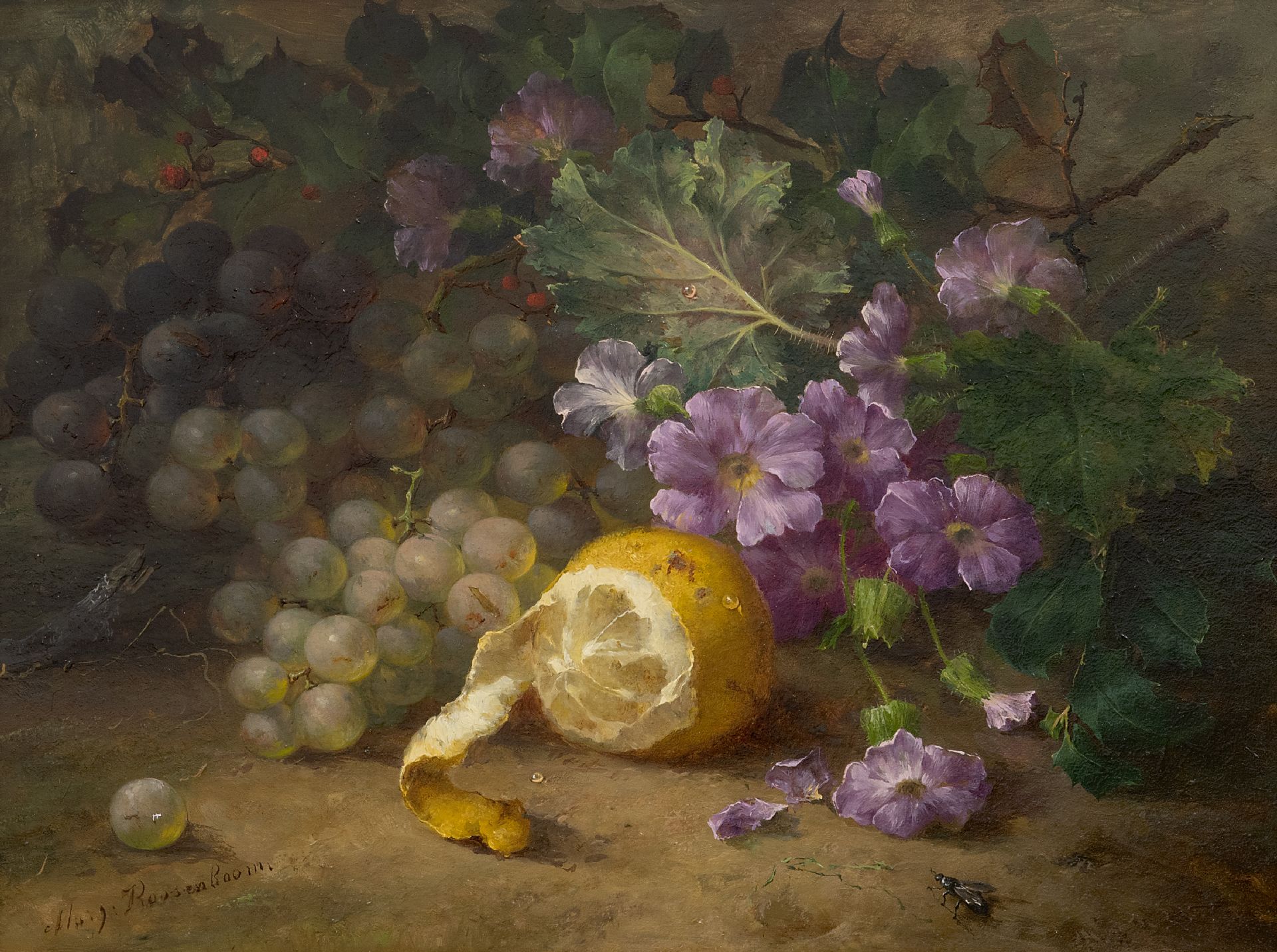 Margaretha Roosenboom kunstwerk • schilderij • te koop Stilleven met druiven, citroen en bloemen op de bosgrond