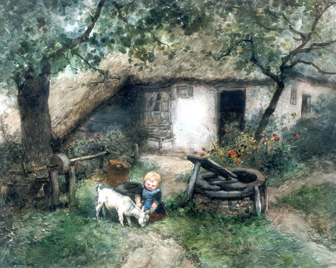 Mari ten Kate kunstwerk • aquarel • tekening • voorheen te koop Meisje met geitje bij de waterput
