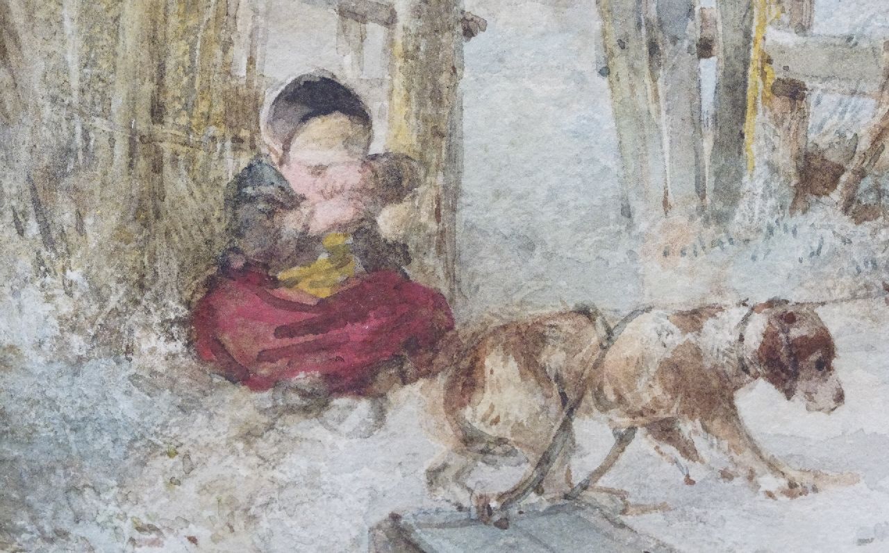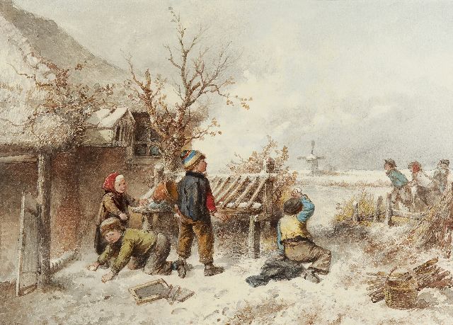 Mari ten Kate kunstwerk • aquarel • tekening • te koop Kinderen spelend in de sneeuw