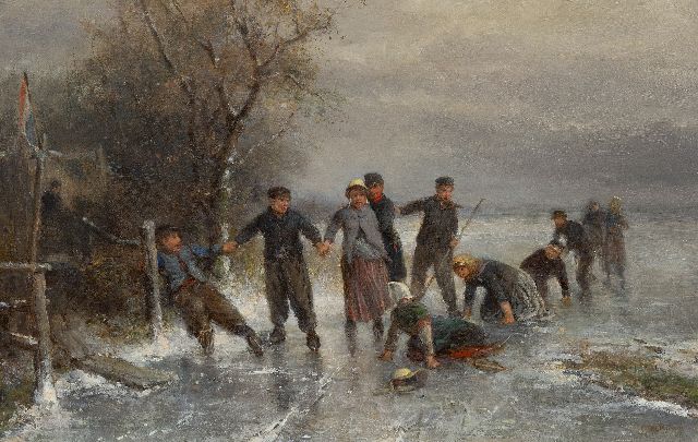 Mari ten Kate | Een valpartij op het ijs, olieverf op doek, 41,0 x 63,9 cm, gesigneerd r.o.