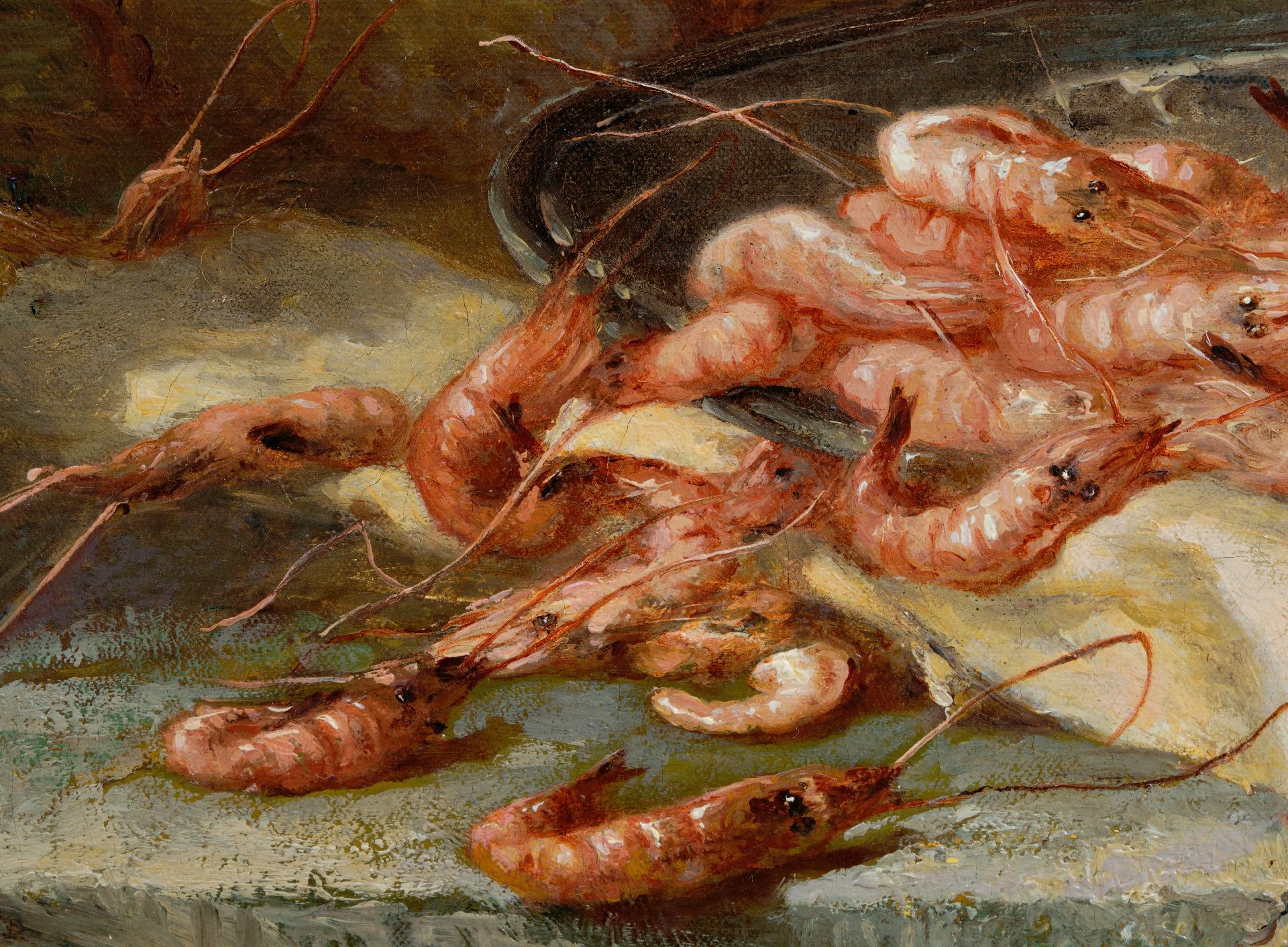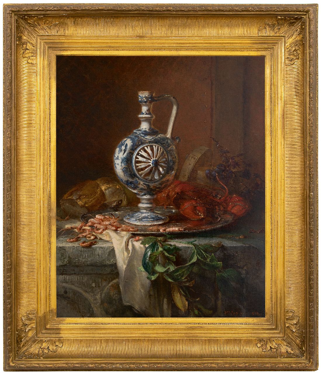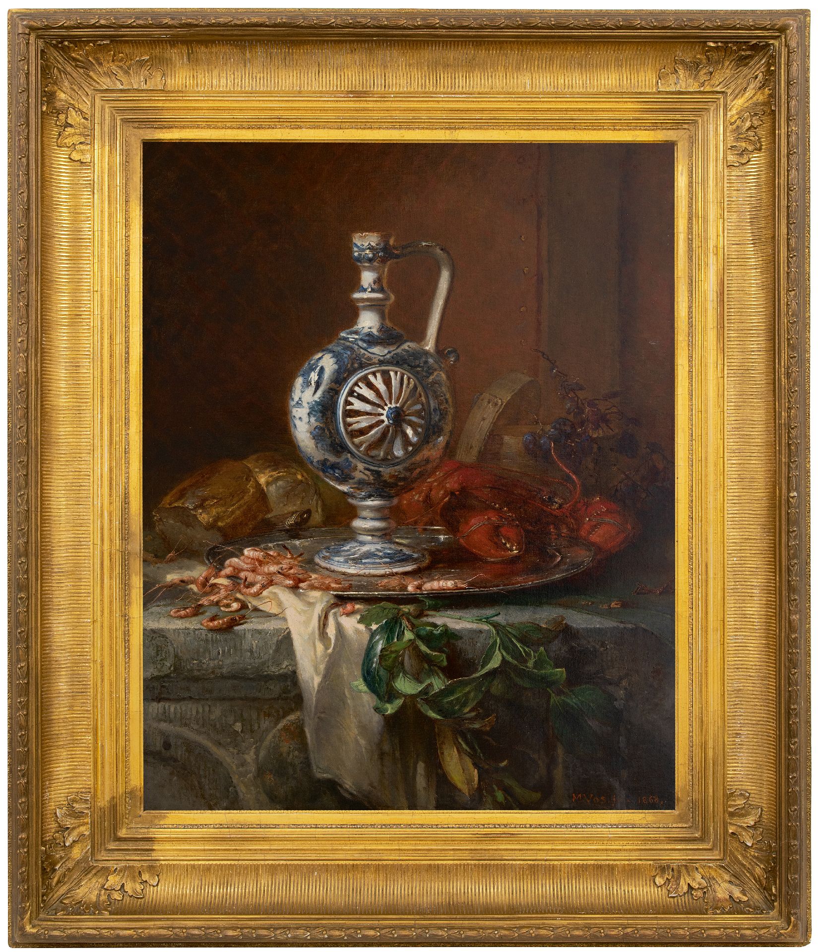 Maria Vos kunstwerk • schilderij • te koop Stilleven met aardewerken fopkan, tinnen schaal, kreeft en garnalen