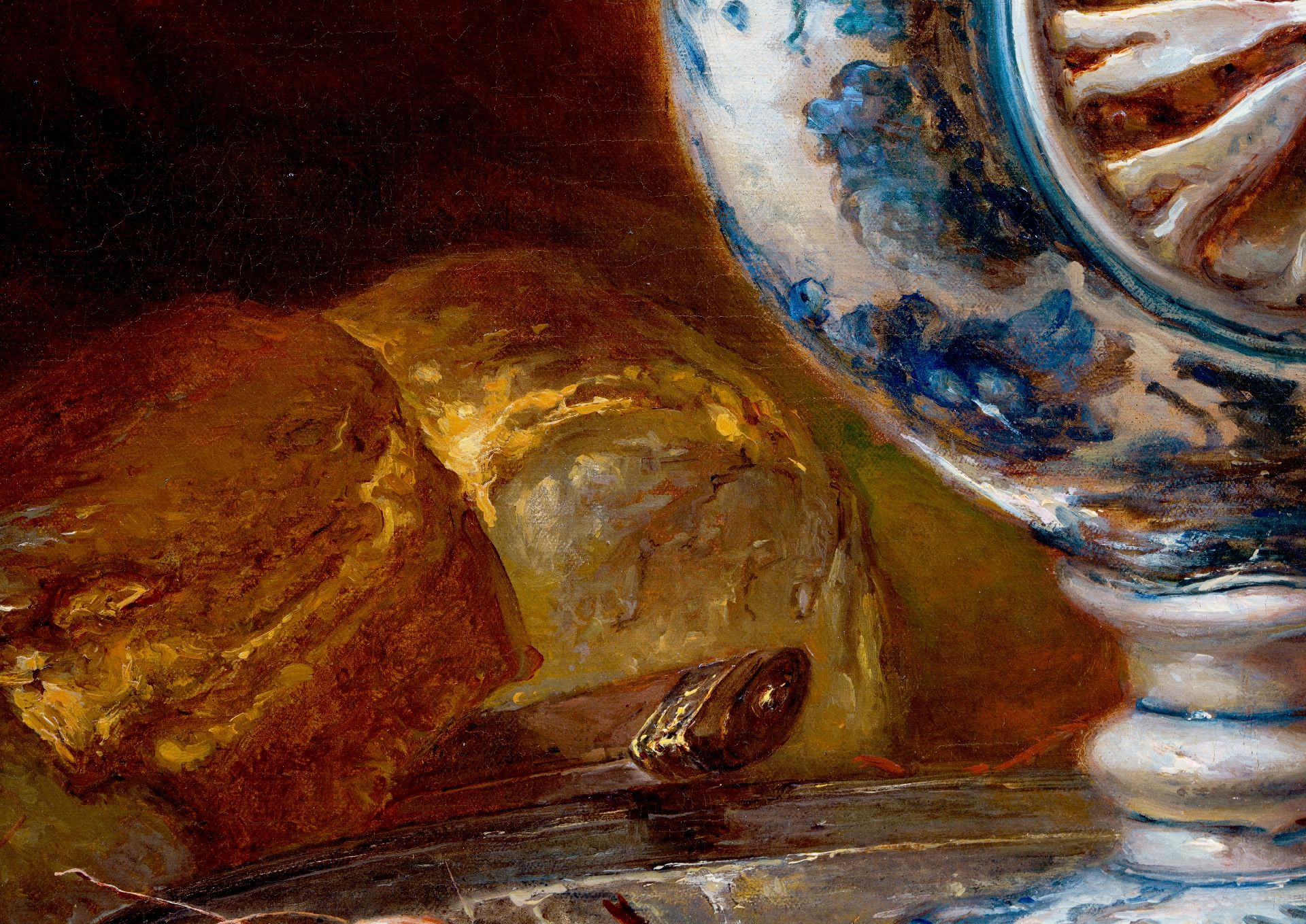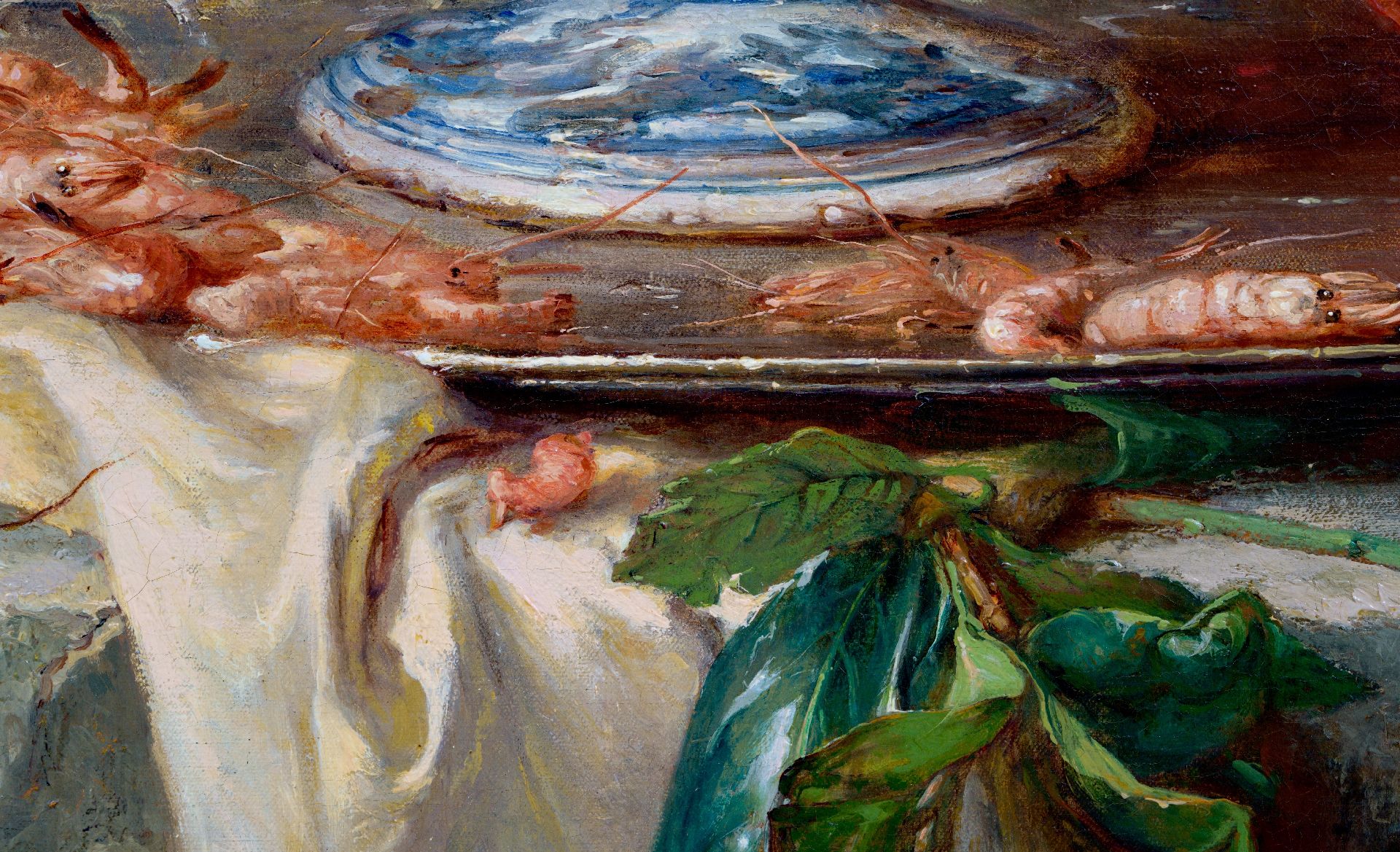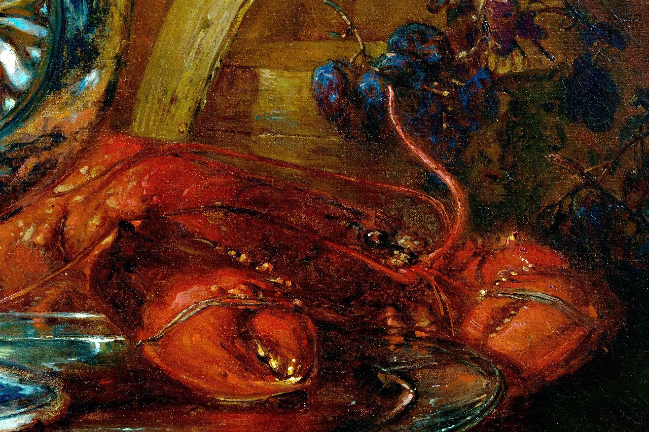 Maria Vos kunstwerk • schilderij • te koop Stilleven met aardewerken fopkan, tinnen schaal, kreeft en garnalen