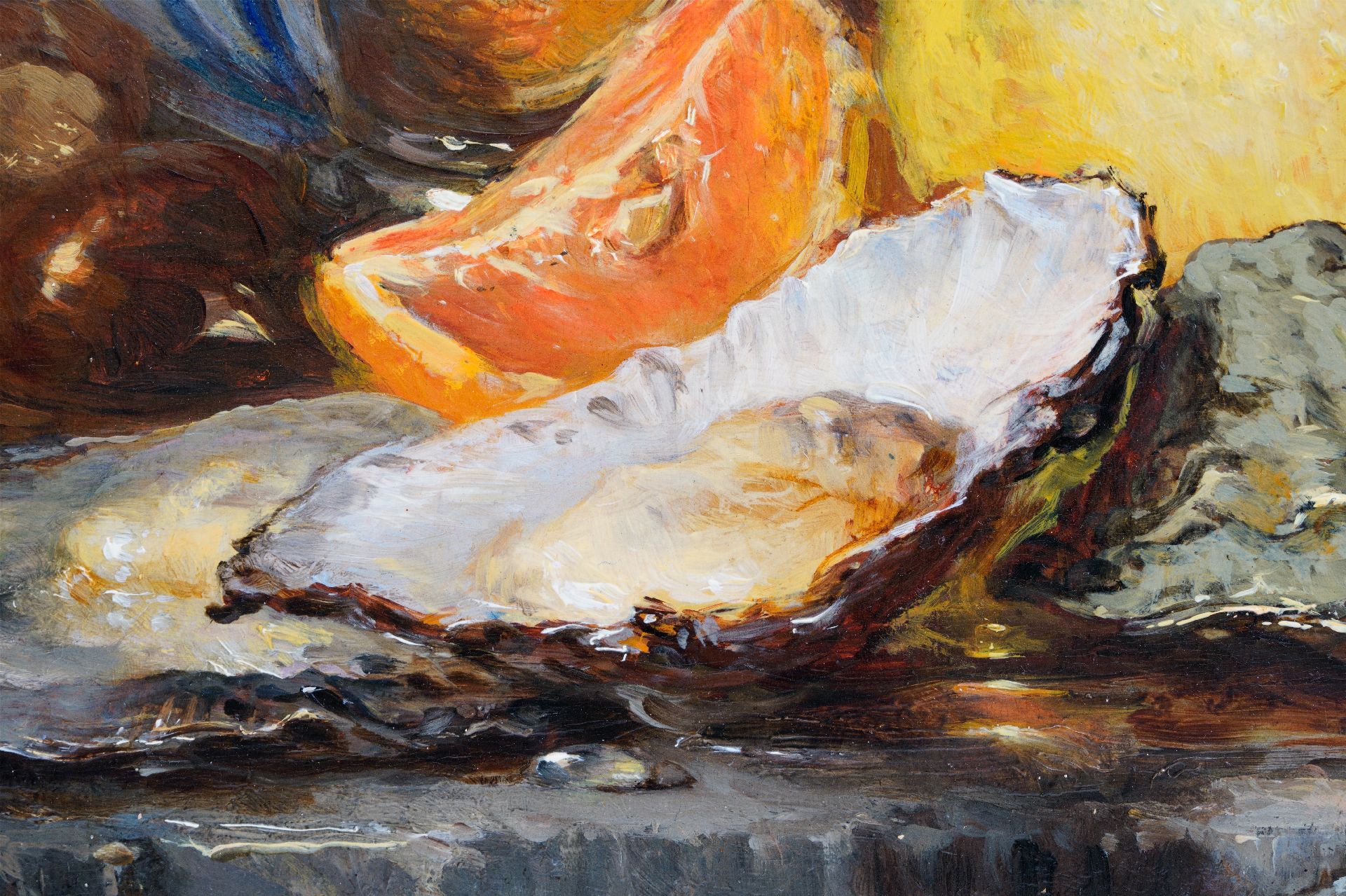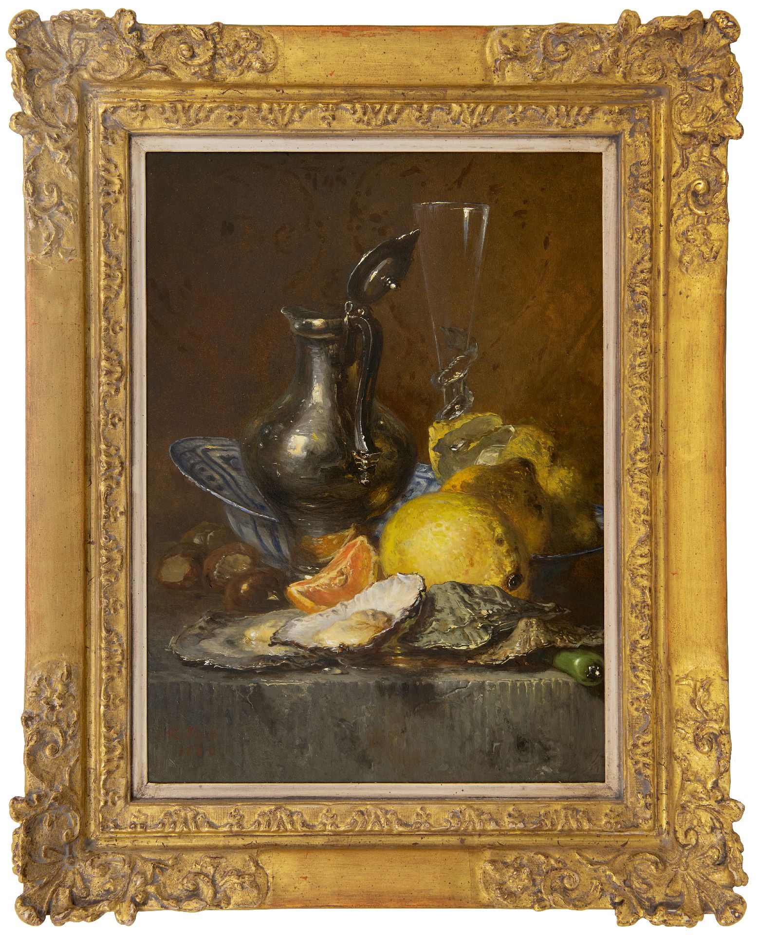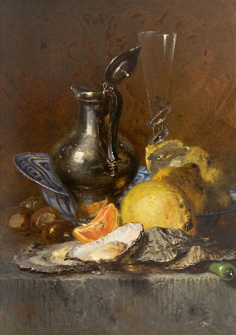 Maria Vos kunstwerk • schilderij • voorheen te koop Stilleven met oesters, citroenen en zilveren kan