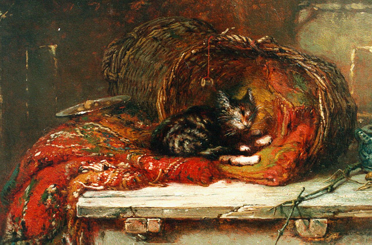 Maria Vos kunstwerk • schilderij • voorheen te koop Stilleven met poes, manden en Perzisch tapijt