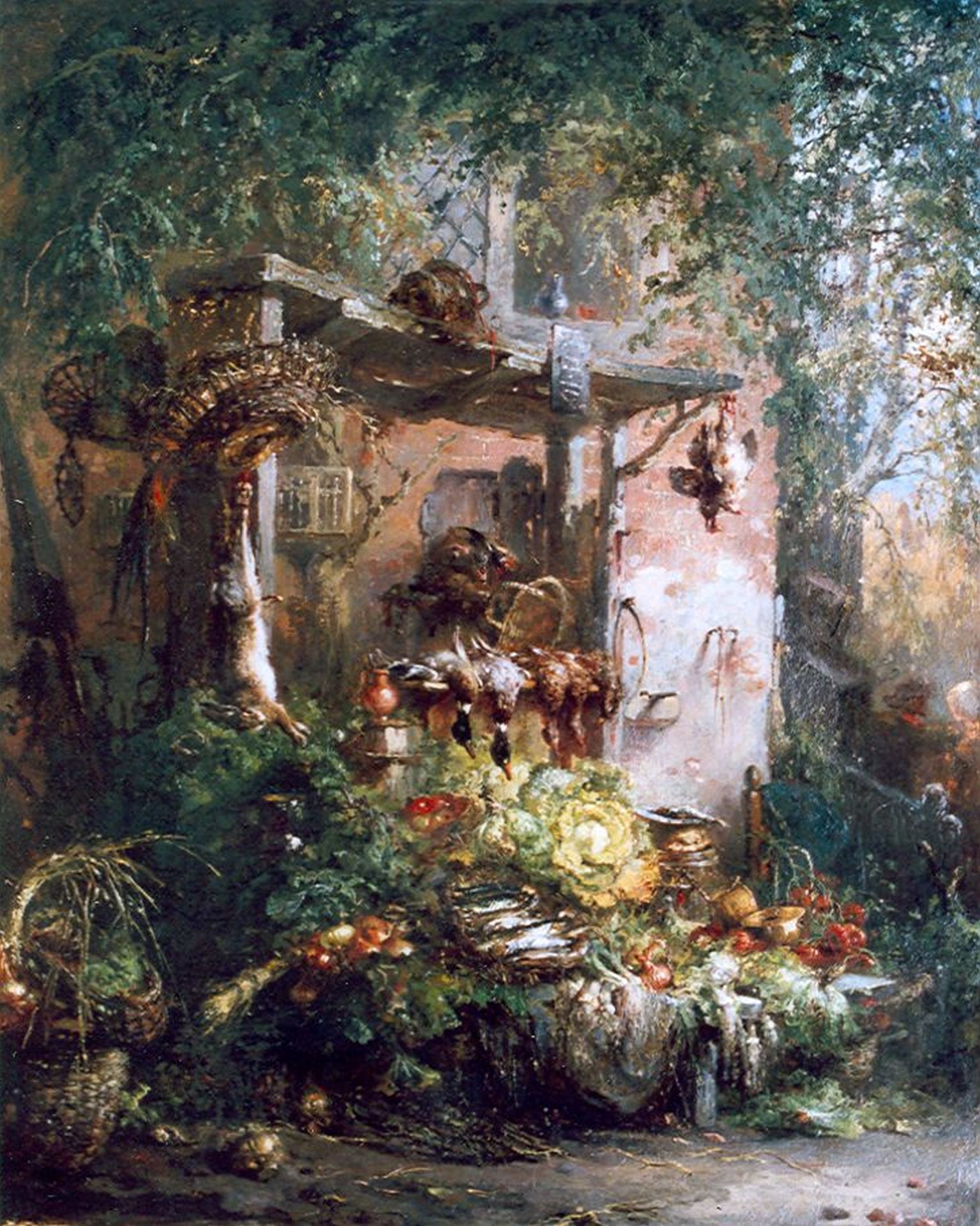 Maria Vos kunstwerk • schilderij • voorheen te koop Stilleven van groente en wild