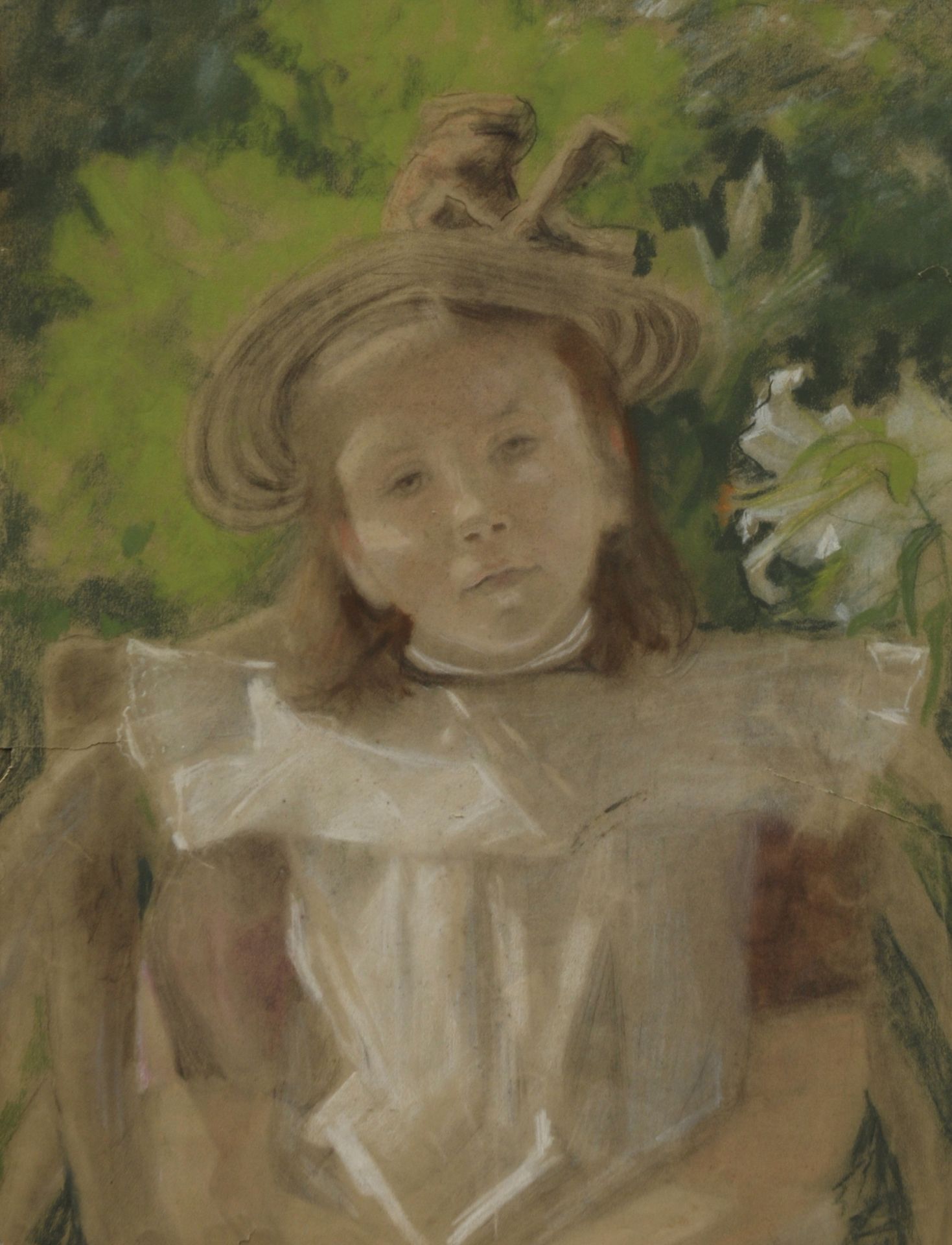 Marie Heineken kunstwerk • aquarel • tekening • te koop Portret van een meisje in een tuin