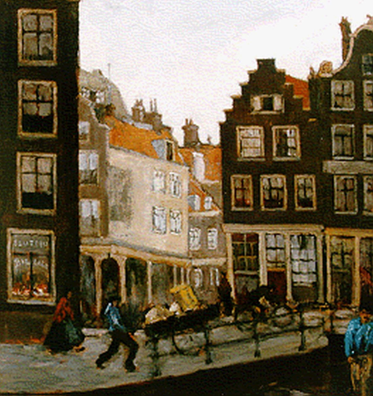 Marie Henri Mackenzie kunstwerk • schilderij • voorheen te koop Amsterdamse gracht met handkar en fietser