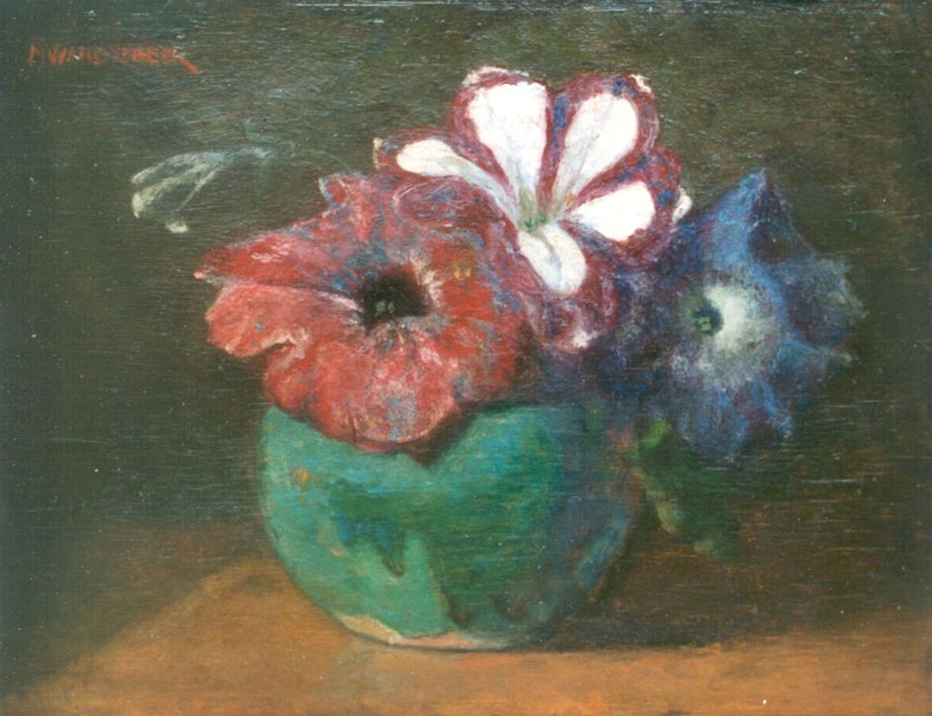 Marie Wandscheer kunstwerk • schilderij • voorheen te koop Petunia's in gemberpot