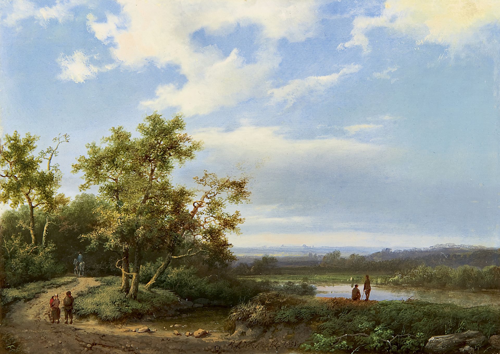 Marinus Adrianus Koekkoek I kunstwerk • schilderij • voorheen te koop Bebost rivierlandschap met landvolk
