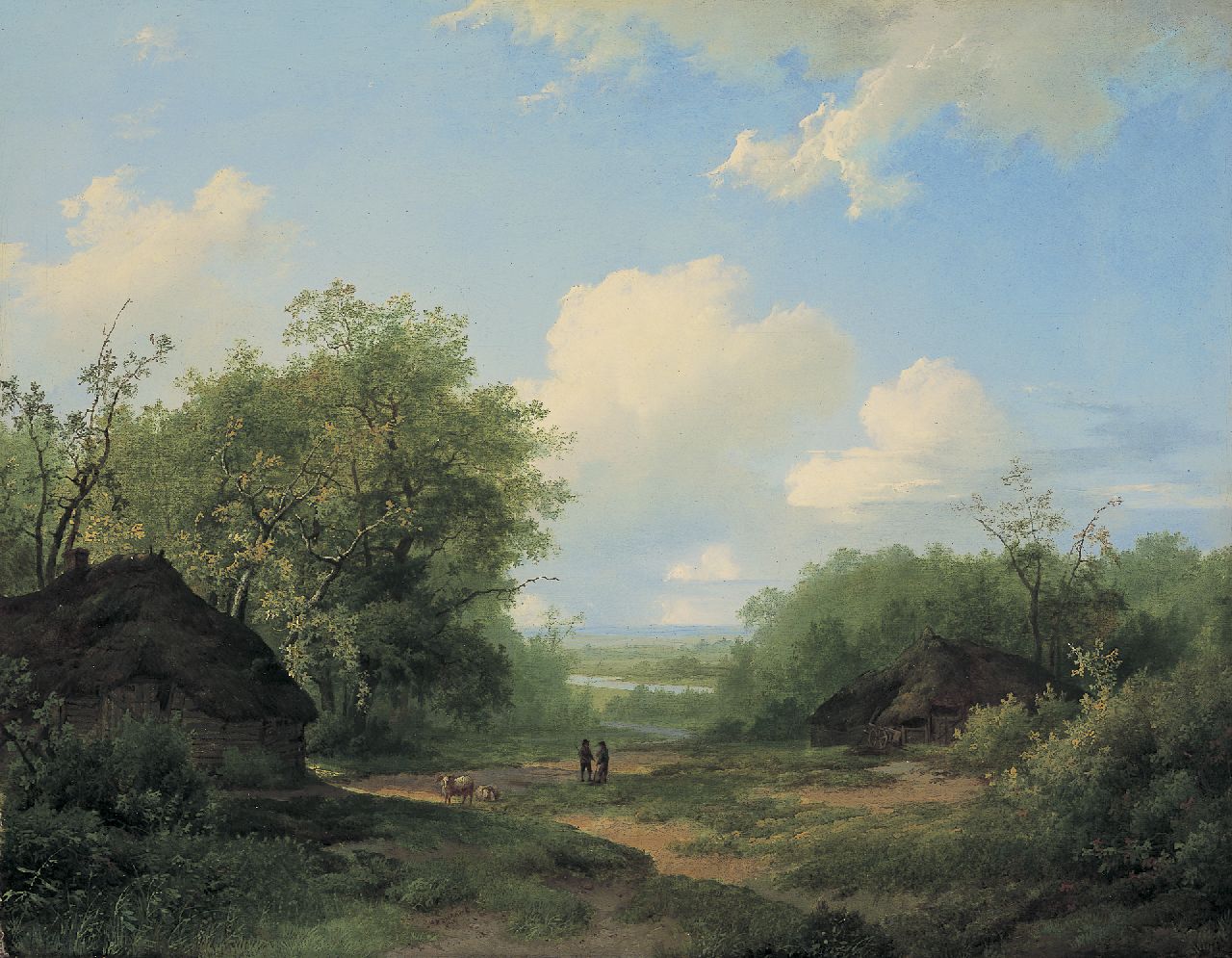 Marinus Adrianus Koekkoek I kunstwerk • schilderij • voorheen te koop Boerenwoningen in een zomers rivierlandschap