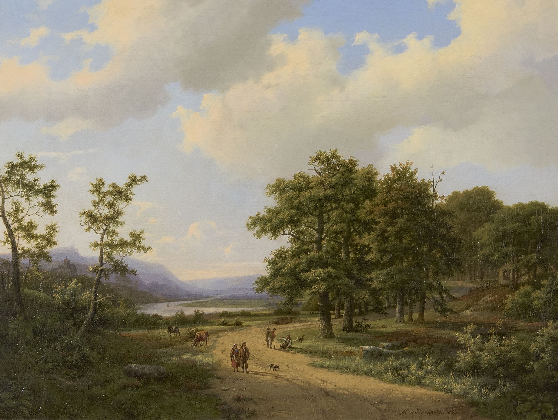 Marinus Adrianus Koekkoek I kunstwerk • schilderij • voorheen te koop Boomrijk landschap met figuren op een landweg
