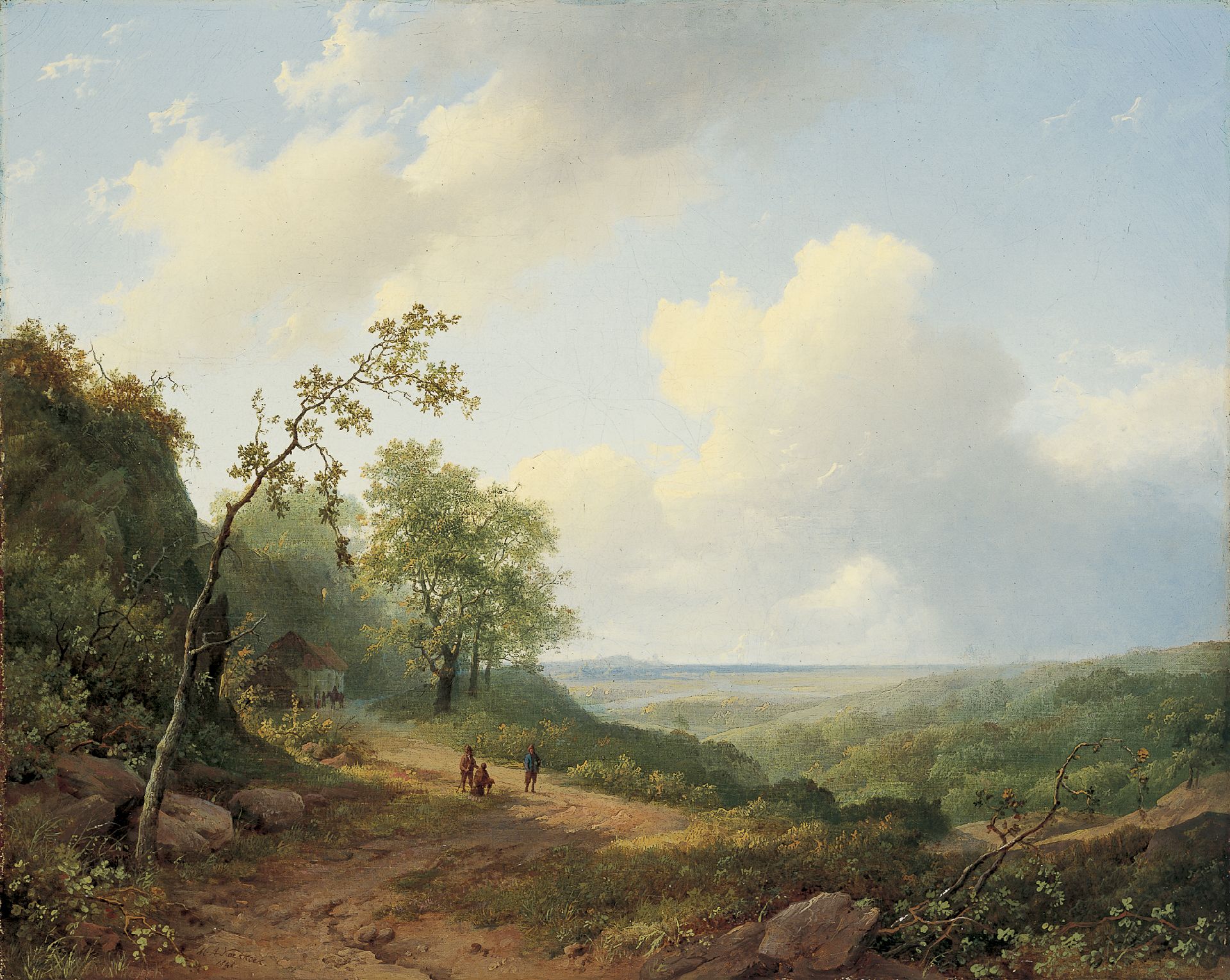Marinus Adrianus Koekkoek I kunstwerk • schilderij • voorheen te koop Heuvelachtig zomerlandschap met enkele wandelaars