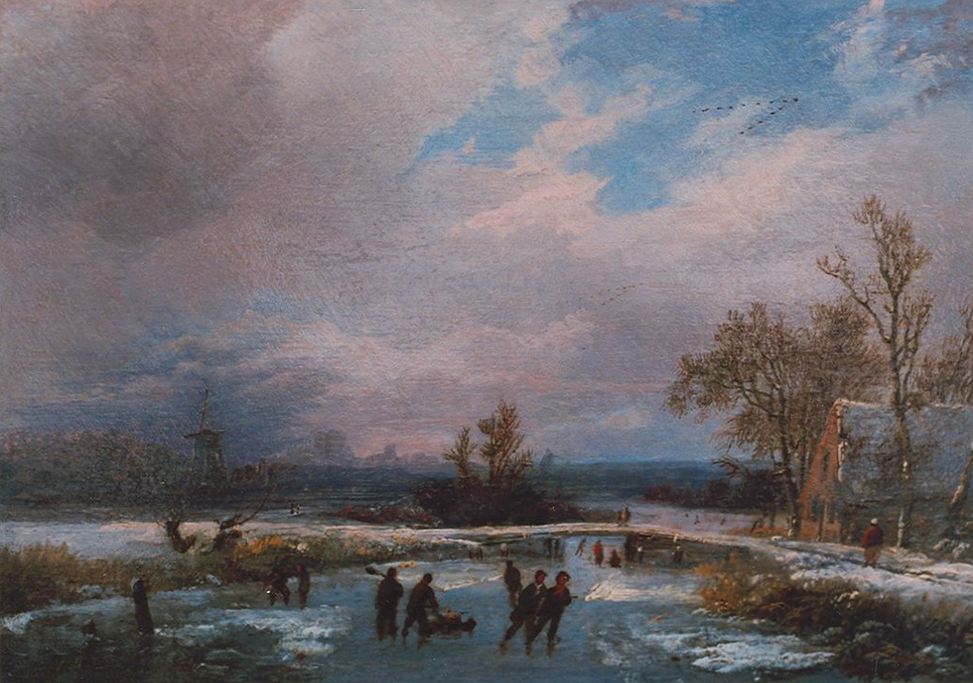 Marinus Adrianus Koekkoek I kunstwerk • schilderij • voorheen te koop IJsgezicht met schaatsers bij een hut