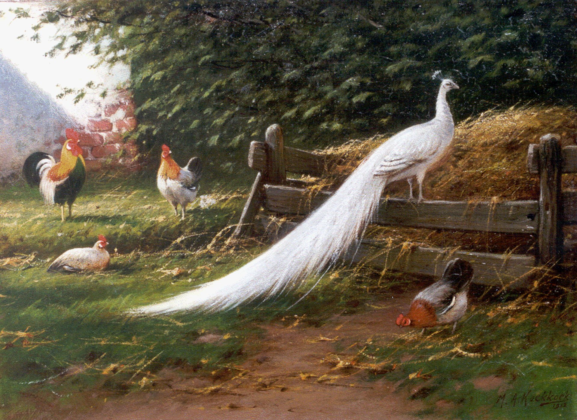 Marinus Adrianus Koekkoek II kunstwerk • schilderij • voorheen te koop Erf met een pauw en kippen