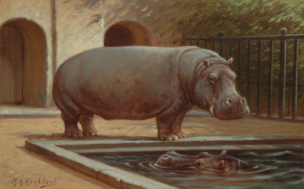 Marinus Adrianus Koekkoek II kunstwerk • schilderij • voorheen te koop Nijlpaarden in het buitenverblijf van Artis