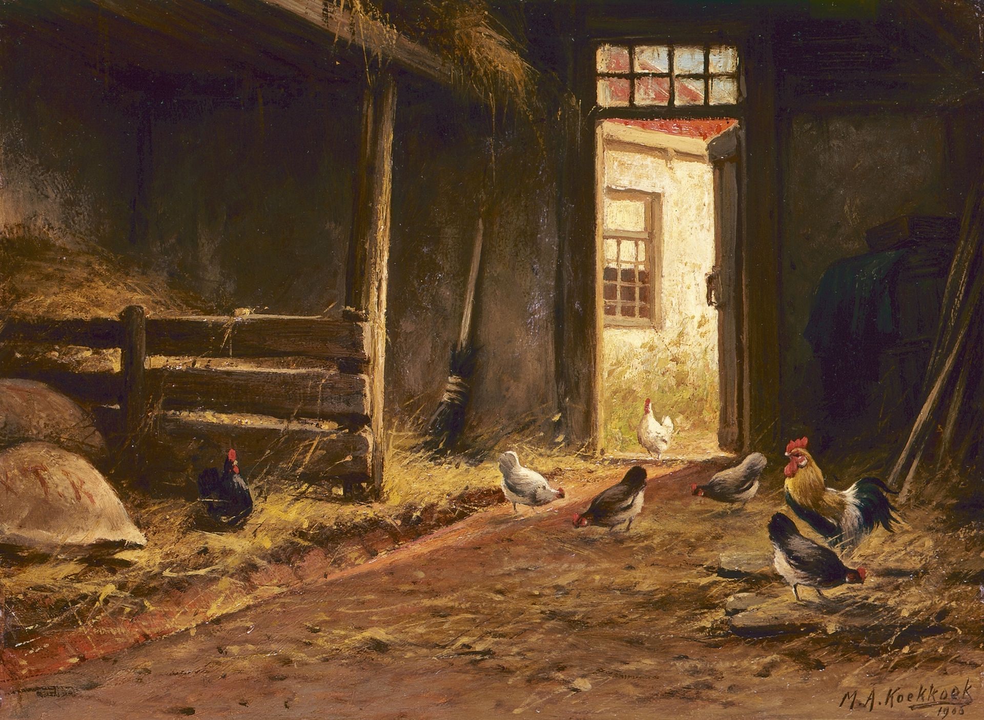 Marinus Adrianus Koekkoek II kunstwerk • schilderij • voorheen te koop Stalinterieur met haan en kippen