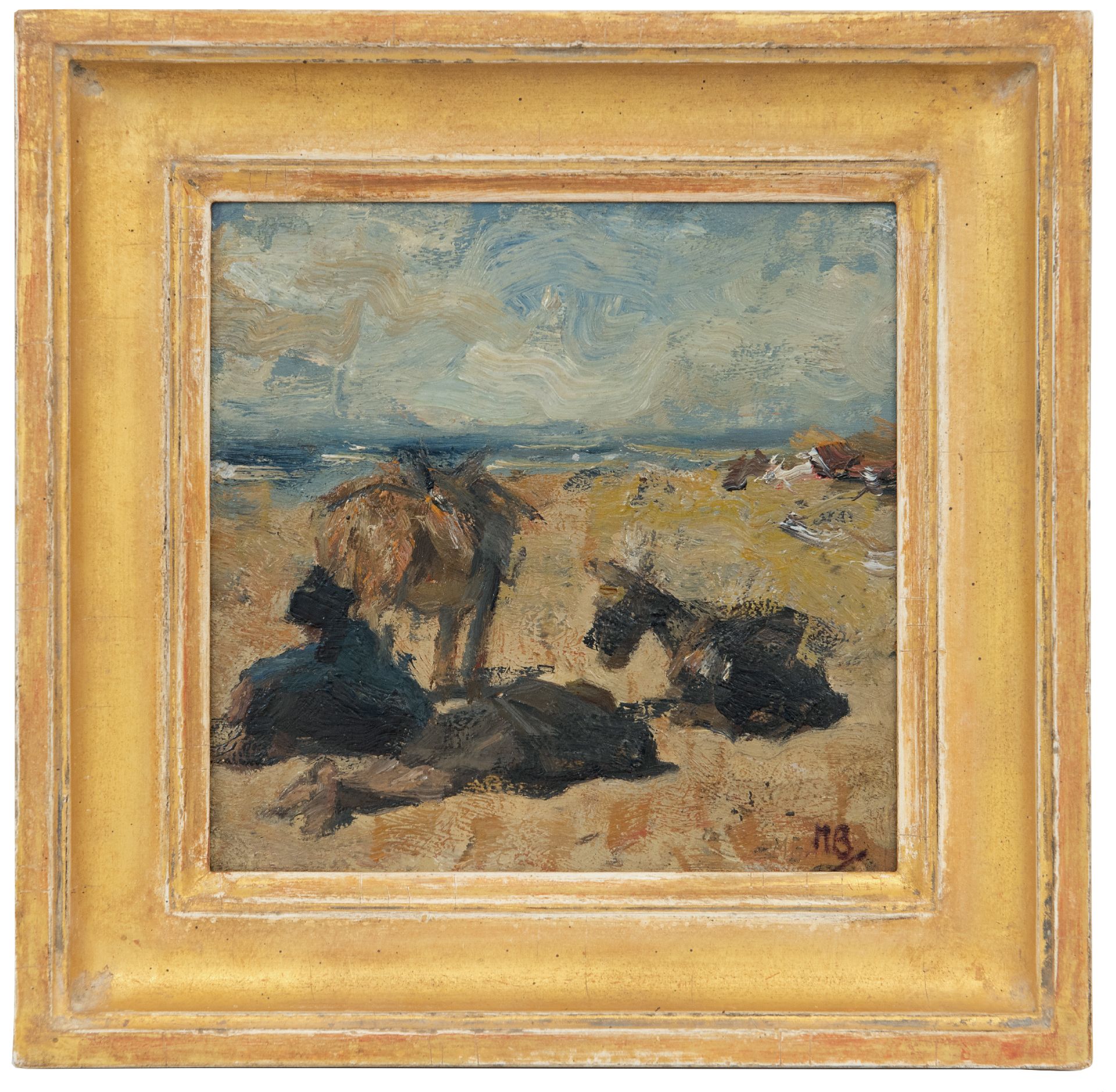 Marius Bauer kunstwerk • schilderij • voorheen te koop Rustende ezels en ezeldrijver op het strand