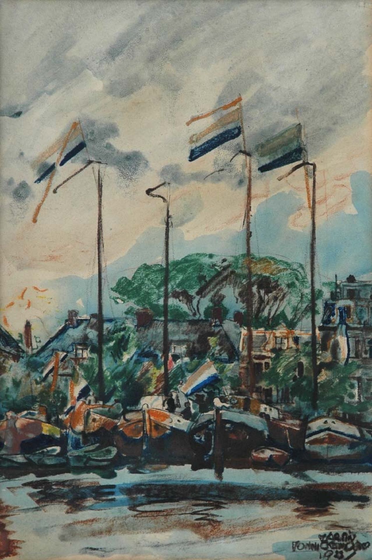 Martin Monnickendam kunstwerk • aquarel • tekening • voorheen te koop Vlaggen op de Amstel