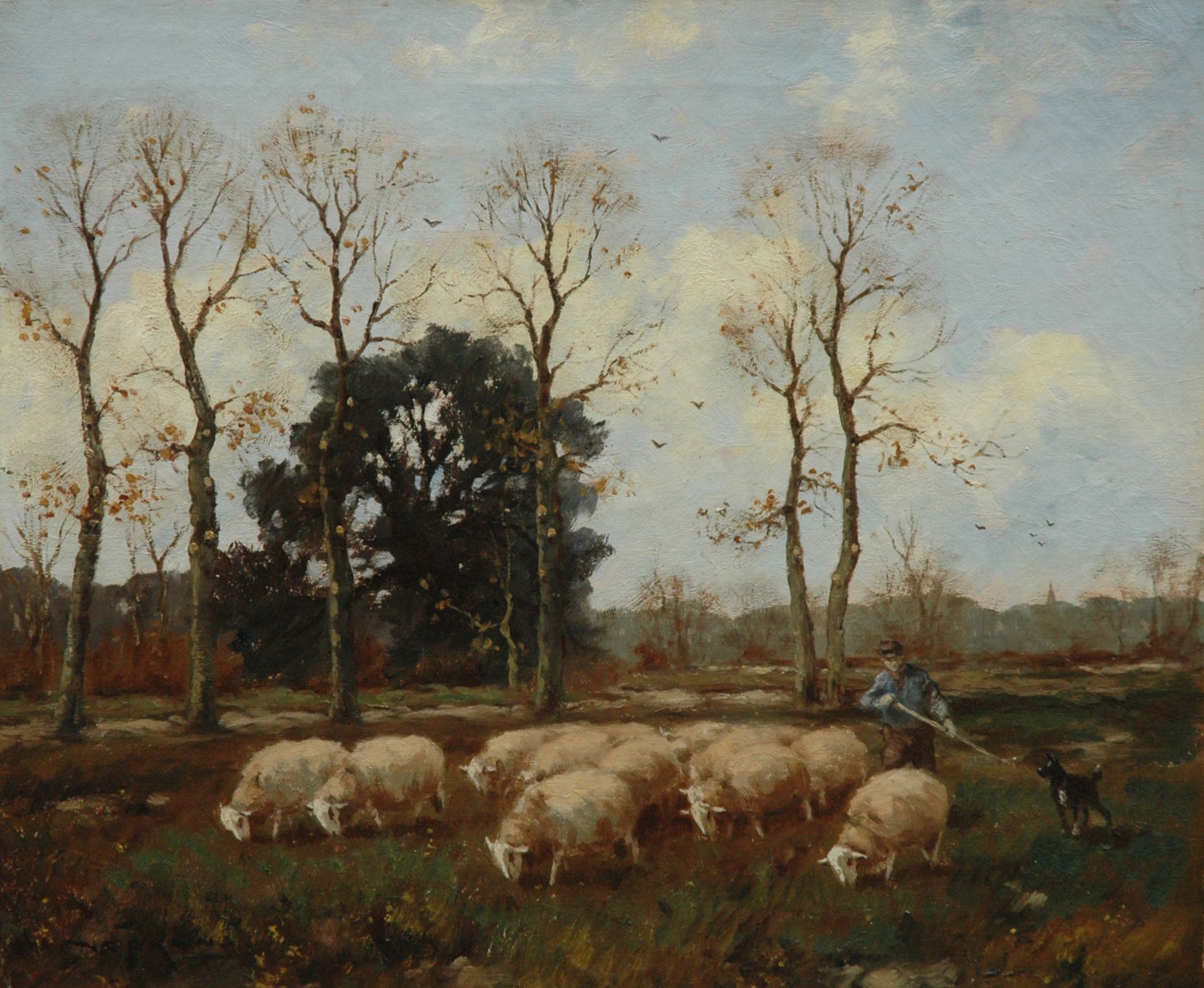 Martinus Nefkens kunstwerk • schilderij • voorheen te koop Herder en hond met kudde schapen
