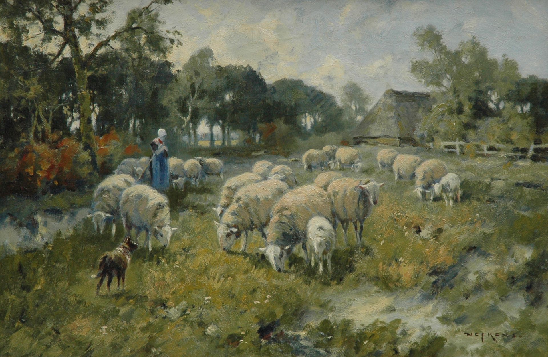 Martinus Nefkens kunstwerk • schilderij • voorheen te koop Veluwse herderin met schapen