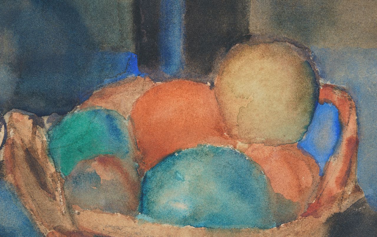 Matthieu Wiegman kunstwerk • aquarel • tekening • te koop Stilleven met geranium, fruit en wijnfles