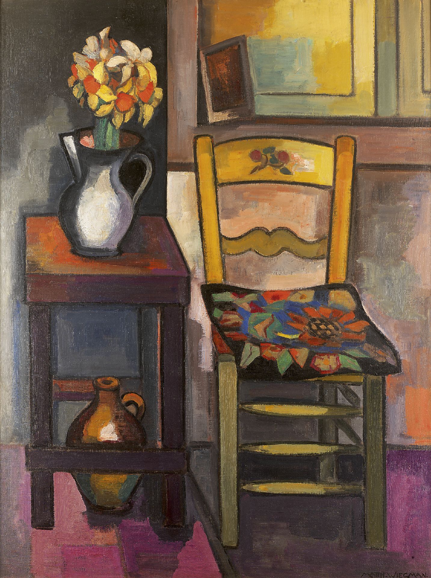 Matthieu Wiegman kunstwerk • schilderij • voorheen te koop Stilleven met stoel; verso: Vrouwelijk naakt