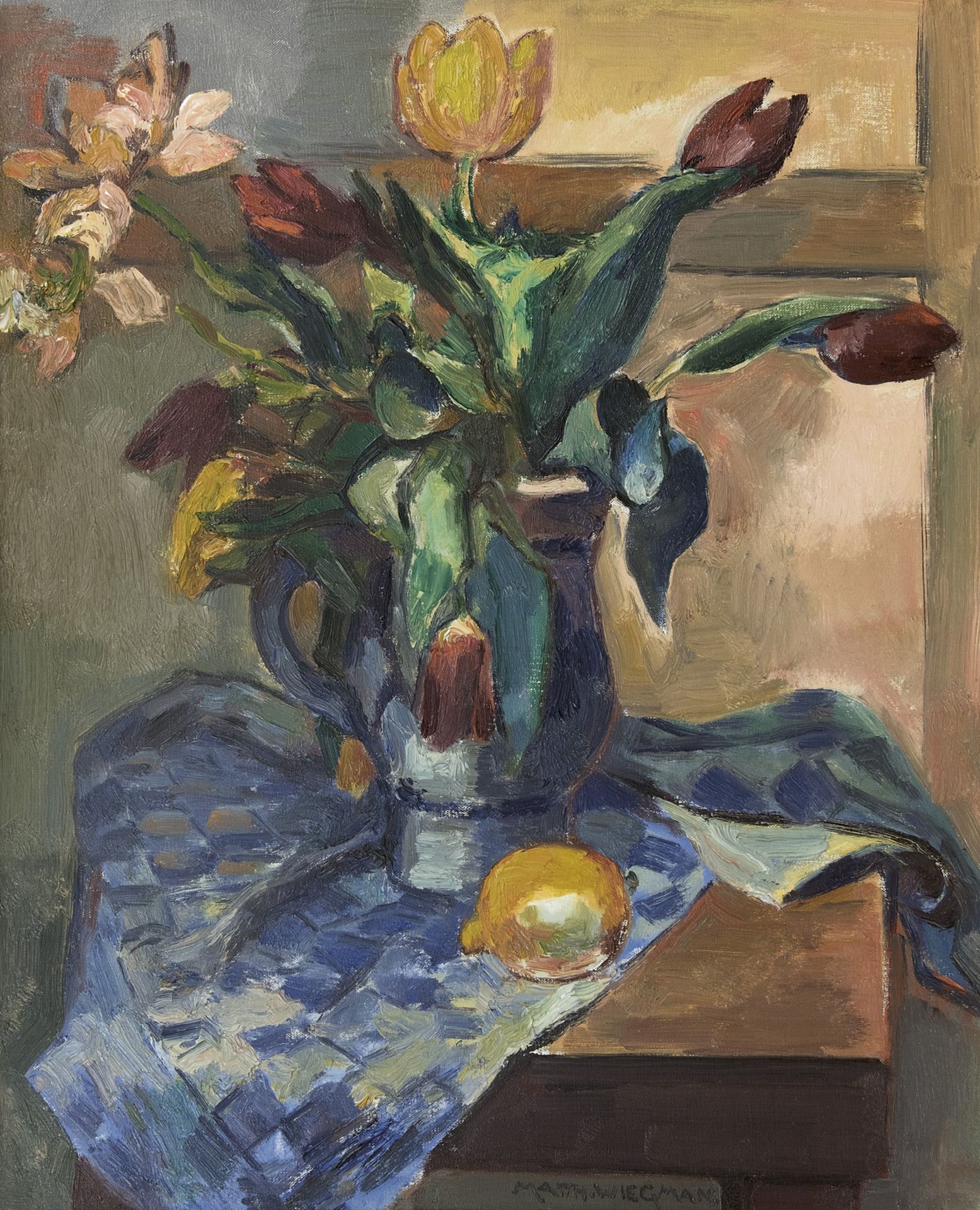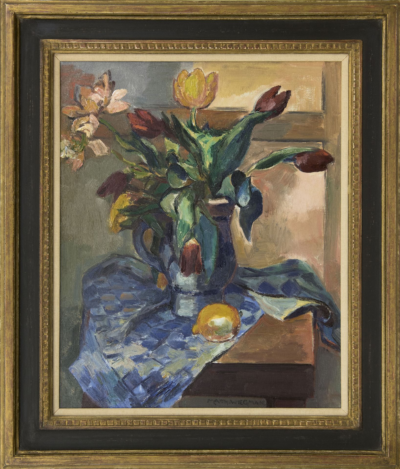 Matthieu Wiegman kunstwerk • schilderij • voorheen te koop Stilleven met tulpen en een citroen