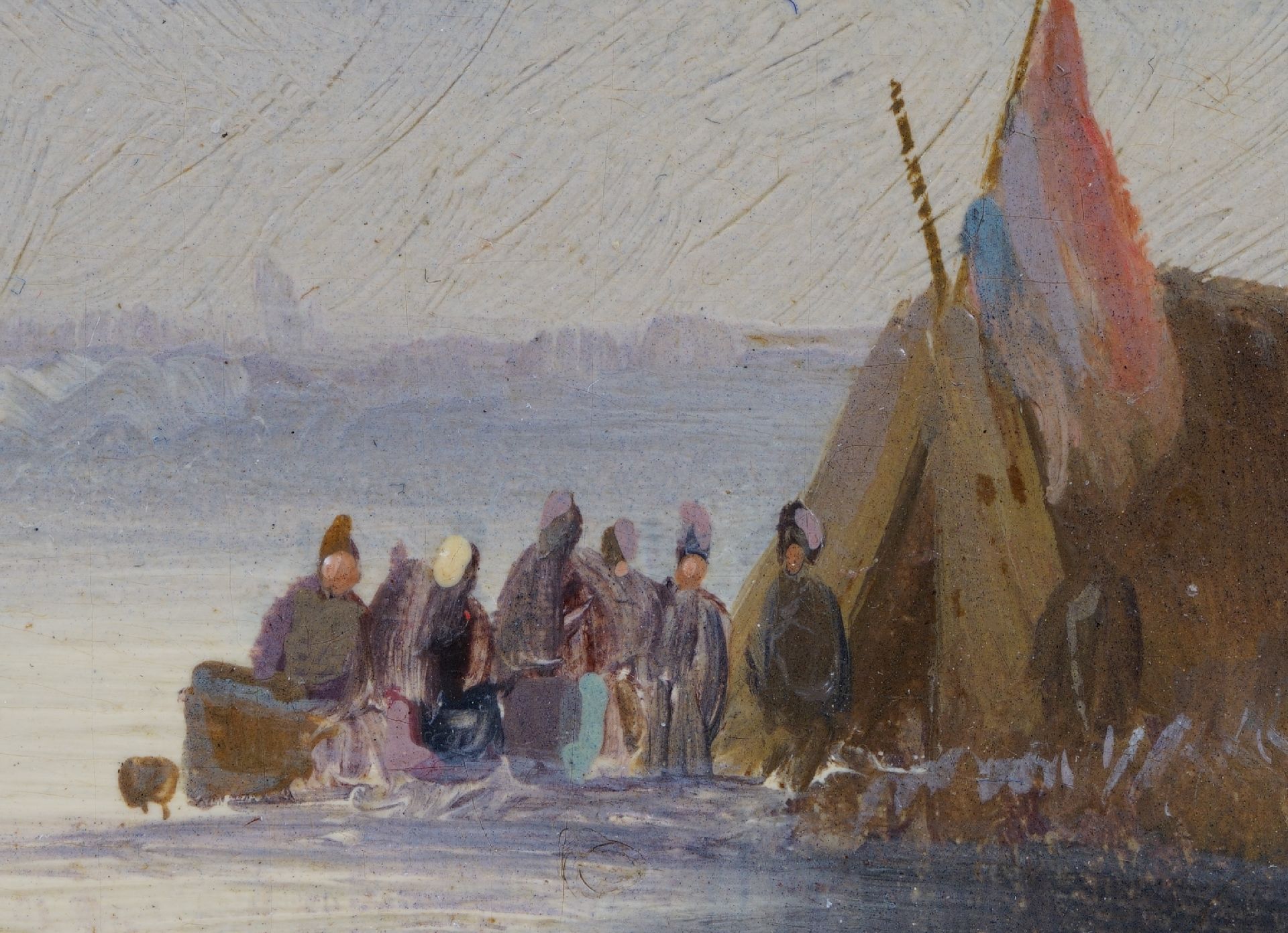 Mattias Parré | IJsgezicht met figuren en vastgevroren schuit, olieverf op paneel, 35,4 x 44,9 cm