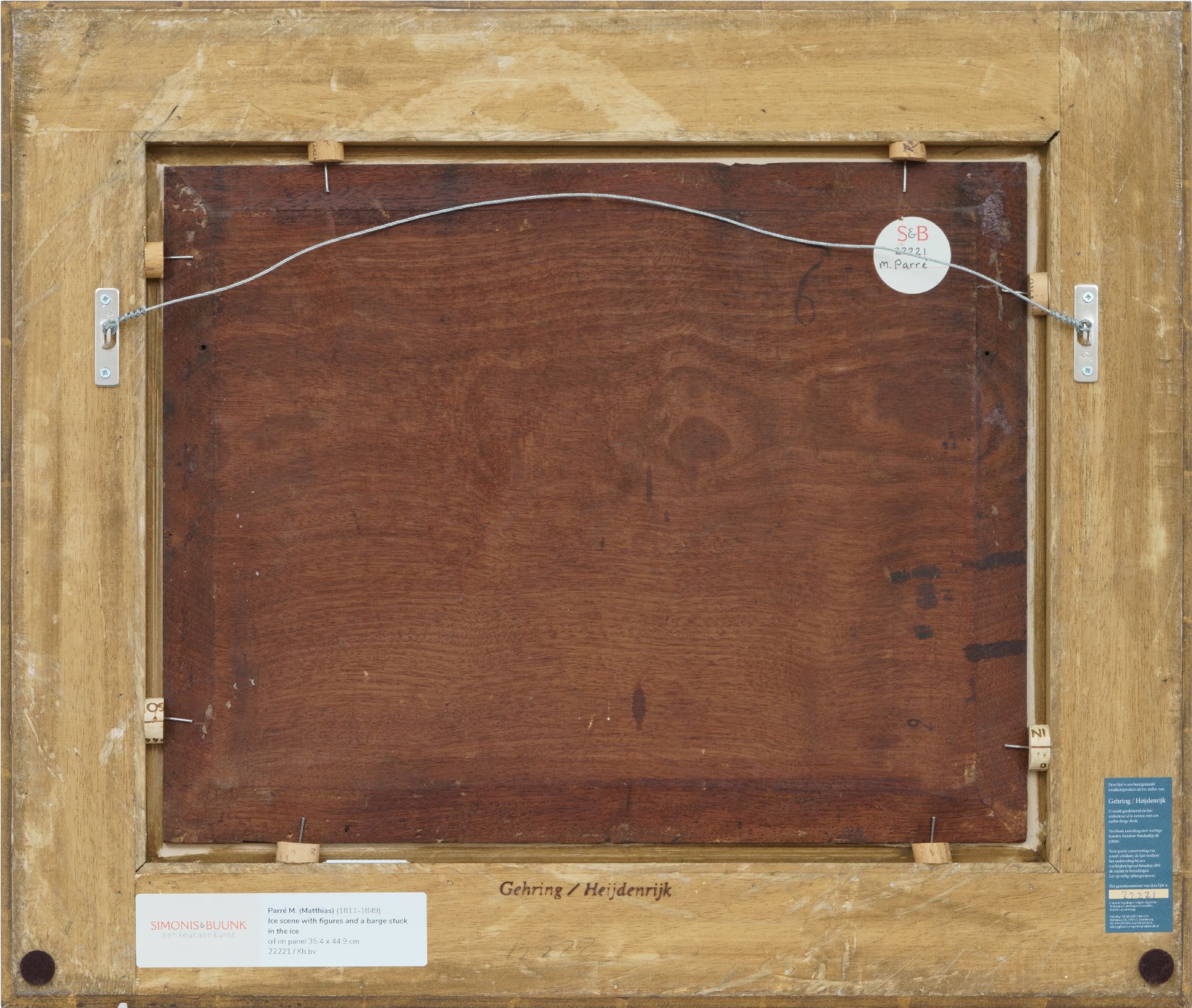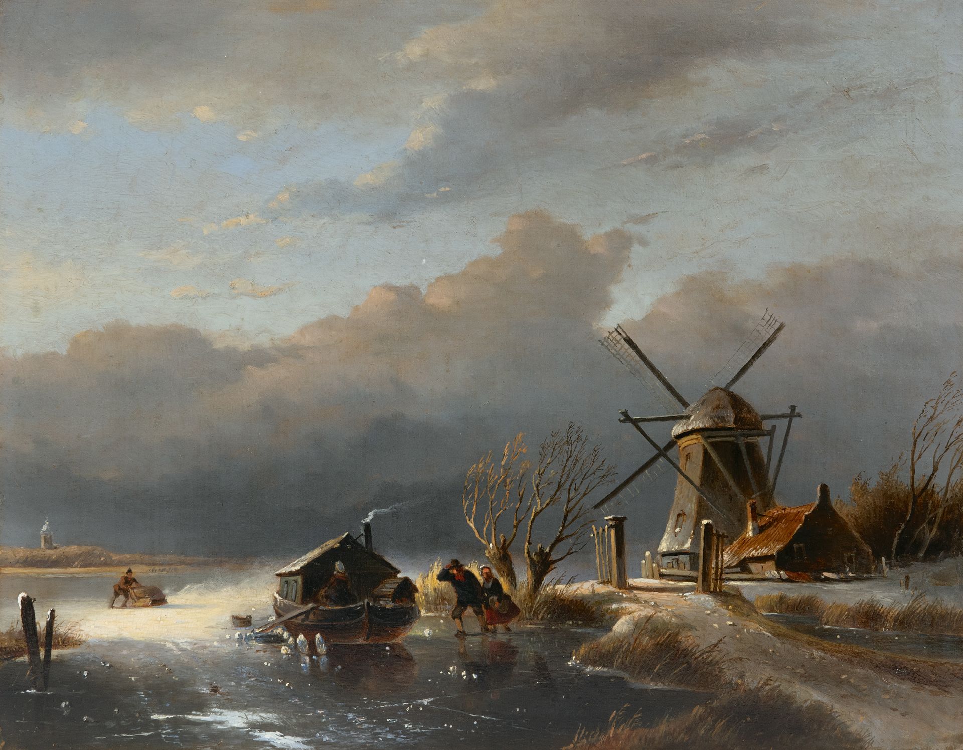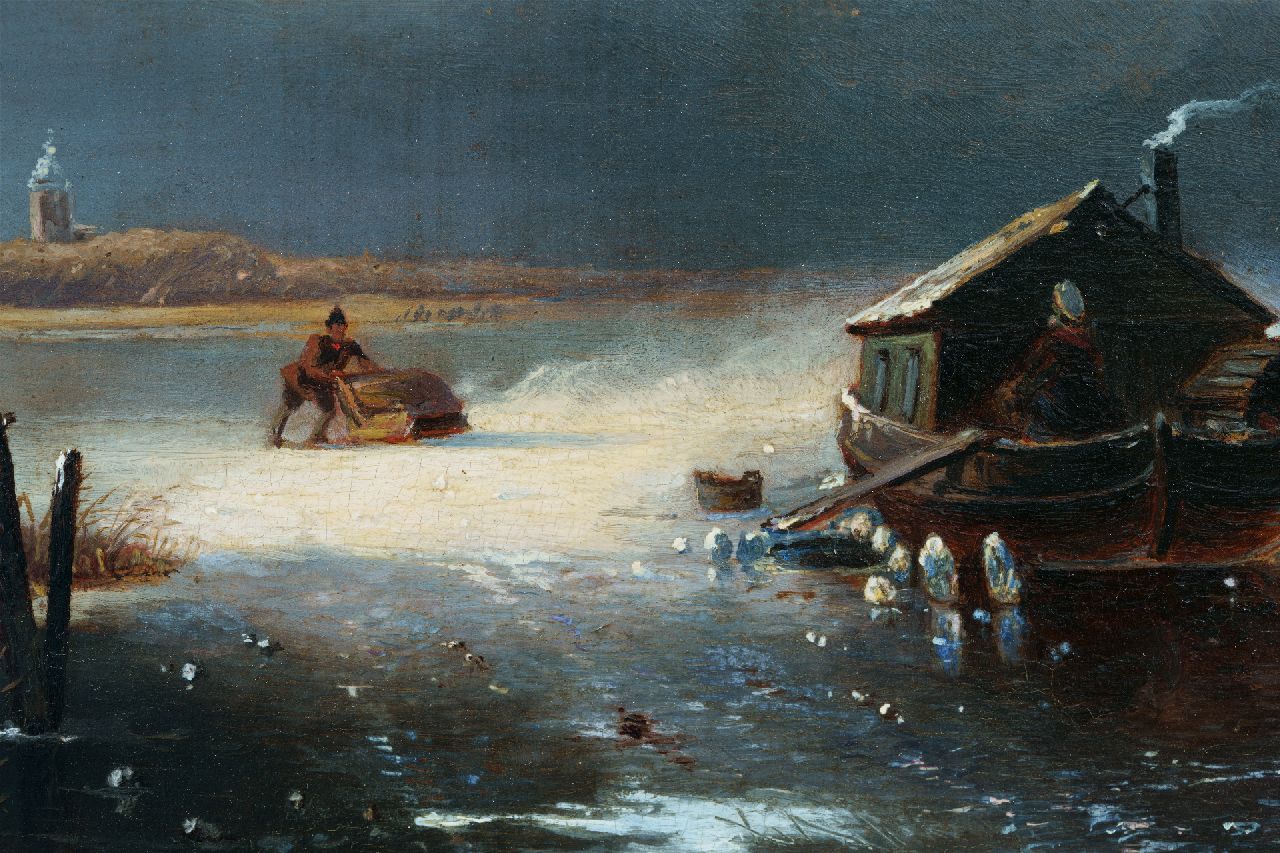 Mattias Parré kunstwerk • schilderij • te koop IJsgezicht met figuren en vastgevroren schuit