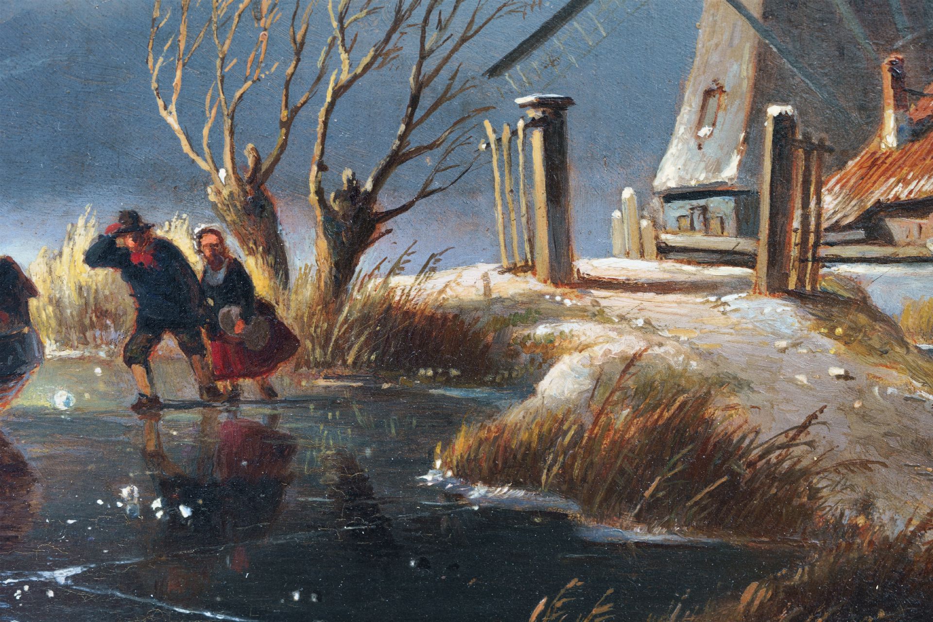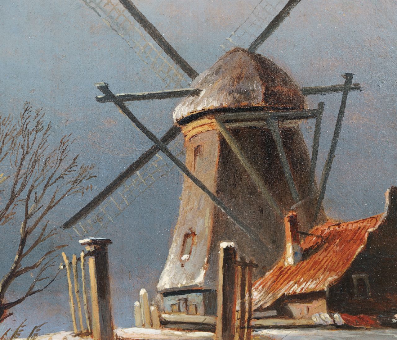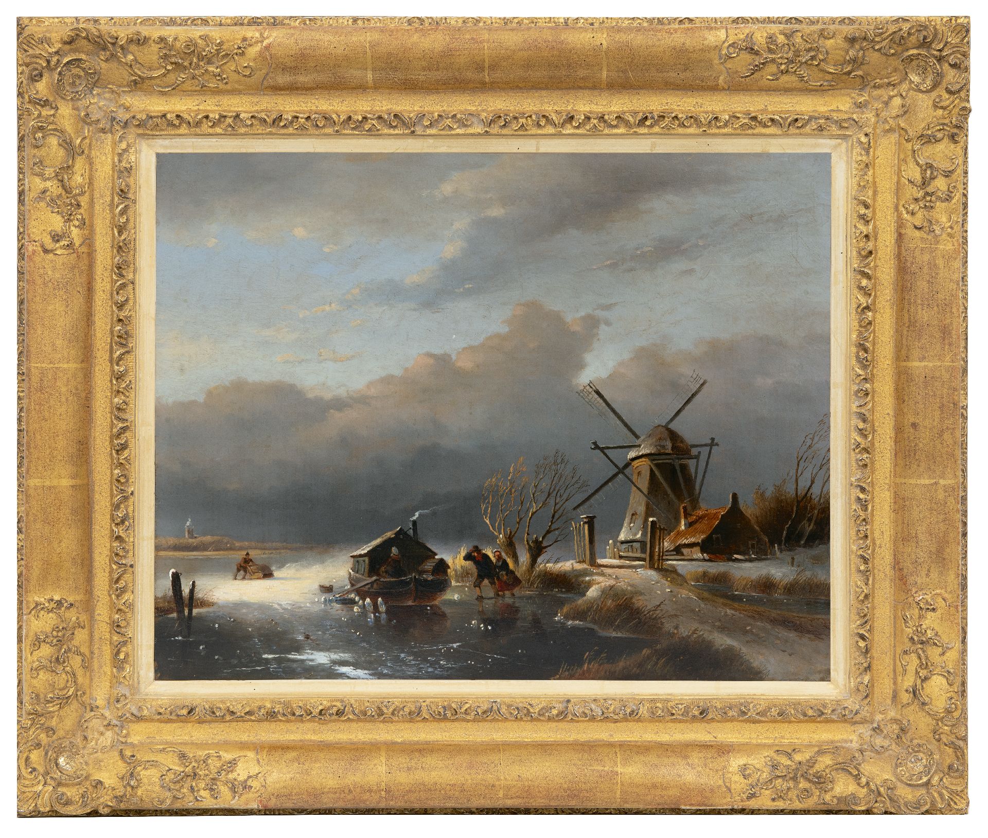 Mattias Parré kunstwerk • schilderij • te koop IJsgezicht met figuren en vastgevroren schuit
