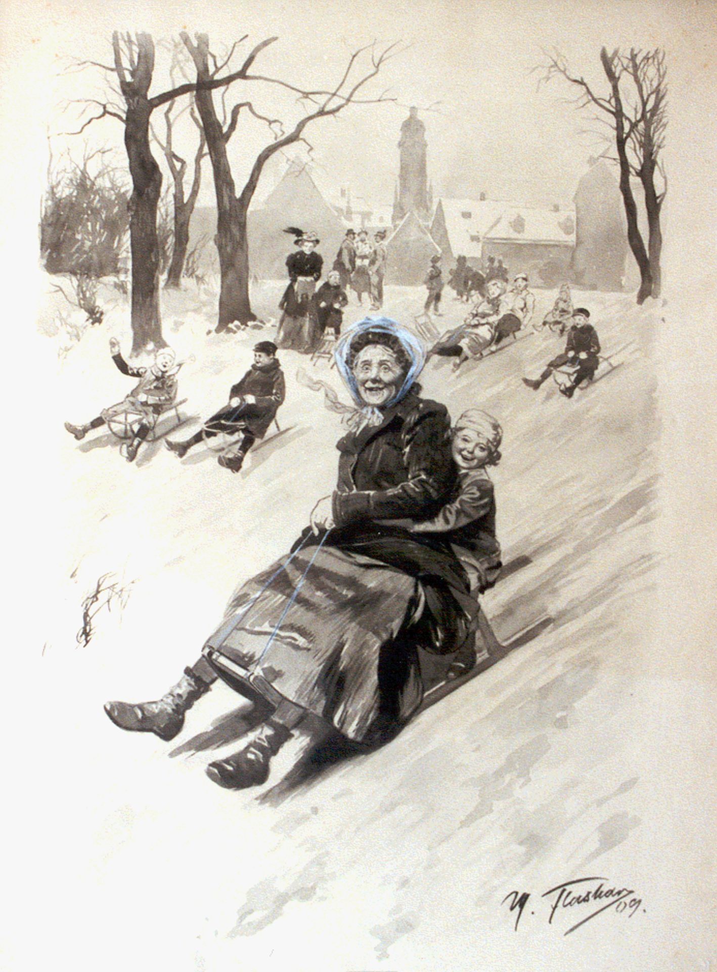Max Flashar kunstwerk • aquarel • tekening • voorheen te koop Een vrolijke glijpartij
