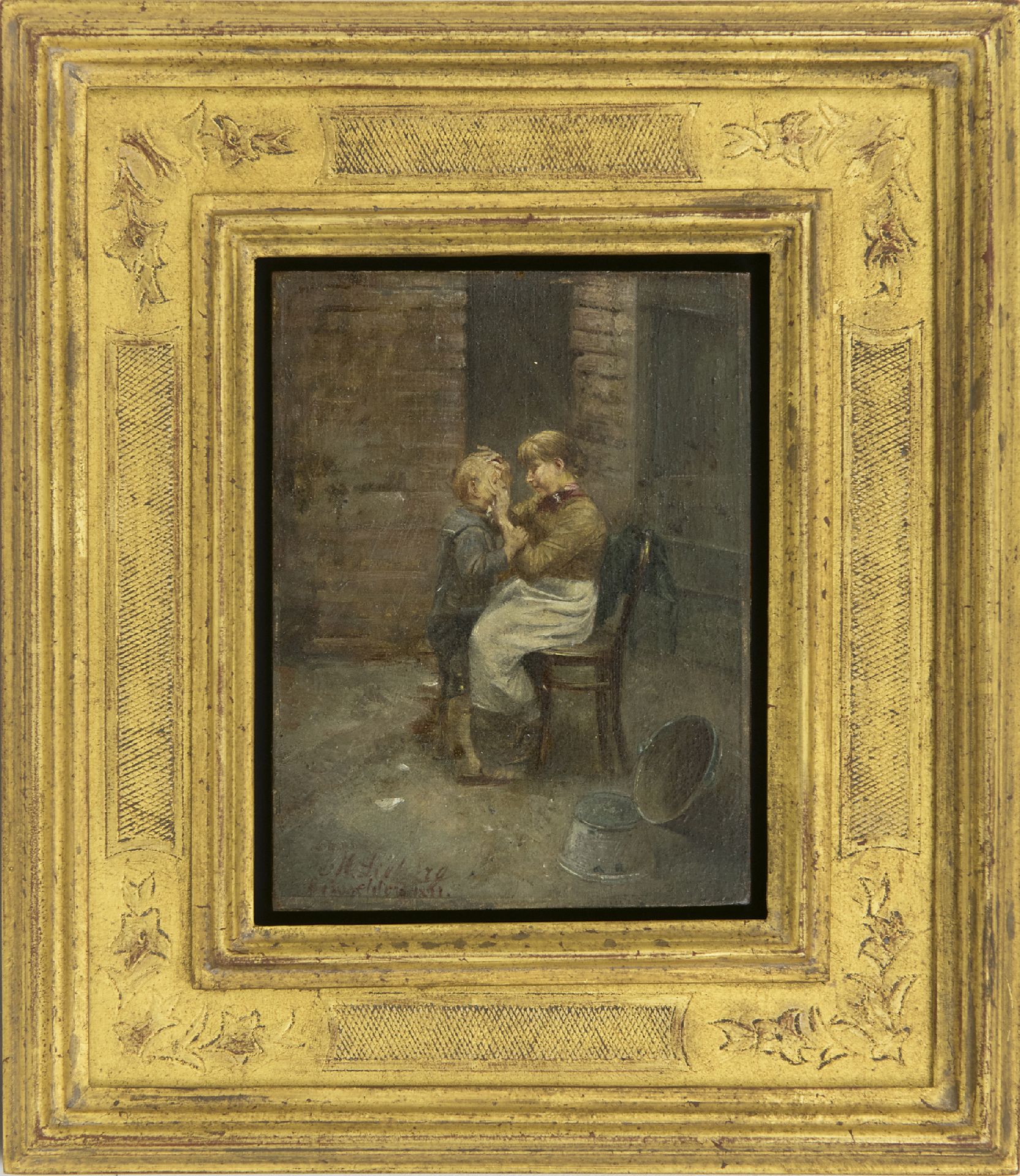 olieverf op paneel 12,0 x 9,0 cm, gesigneerd linksonder en 'Düsseldorf' 1891