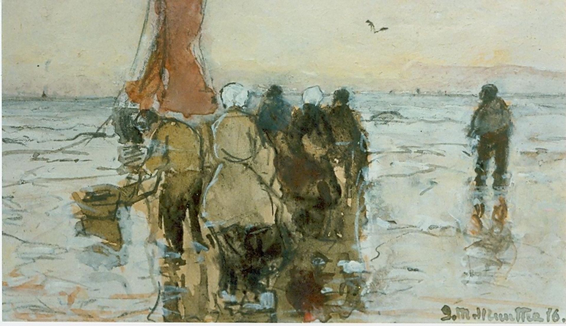 Morgenstjerne Munthe kunstwerk • aquarel • tekening • voorheen te koop Vissers op het strand