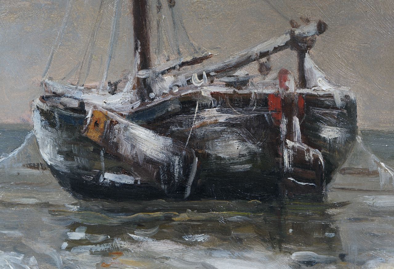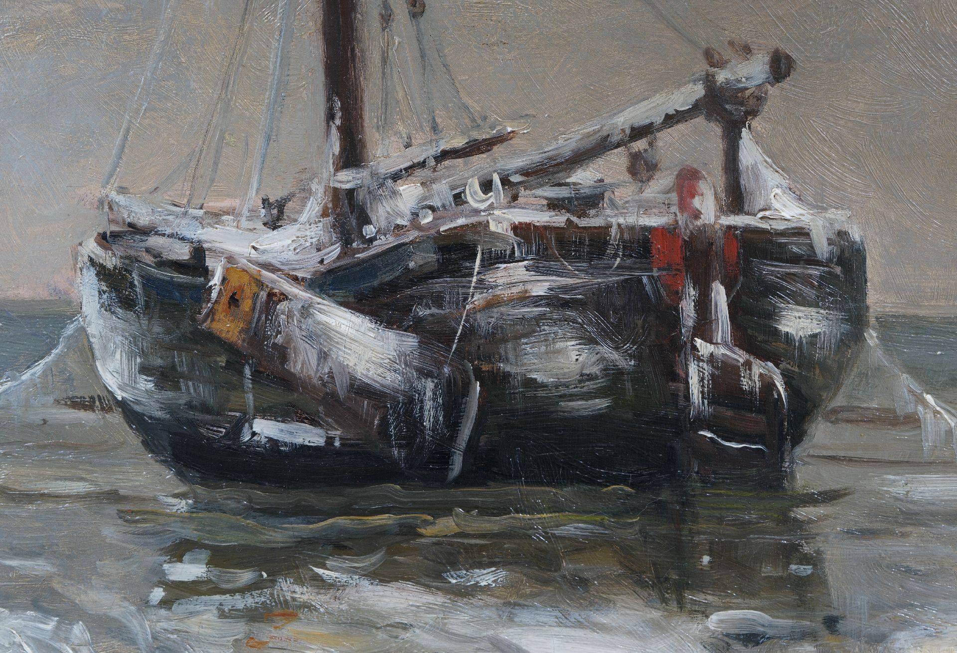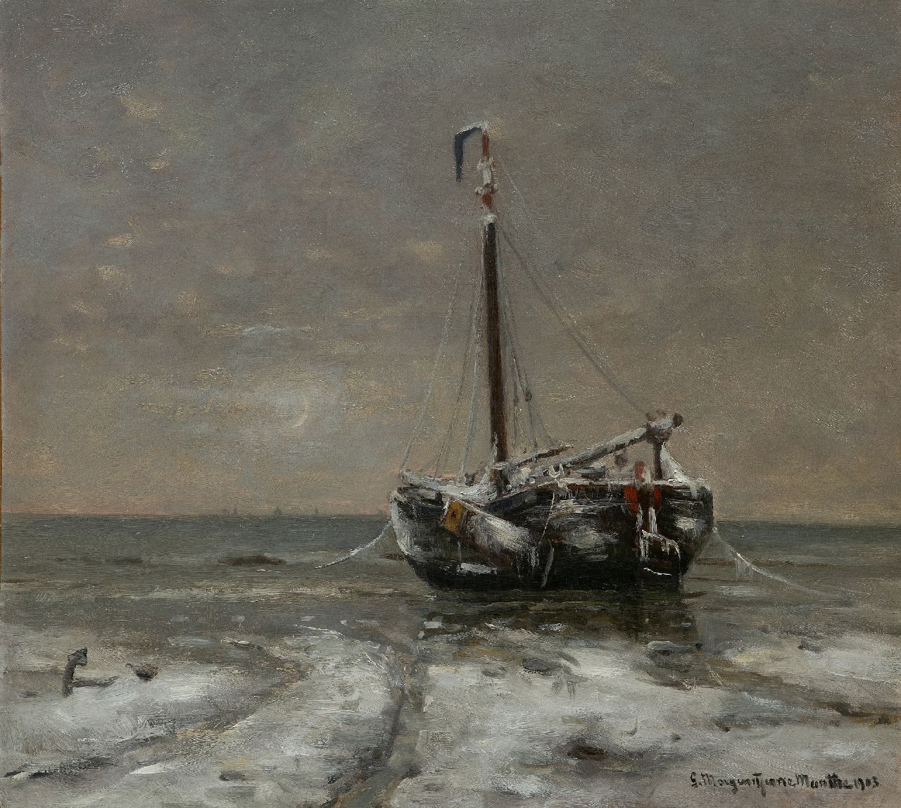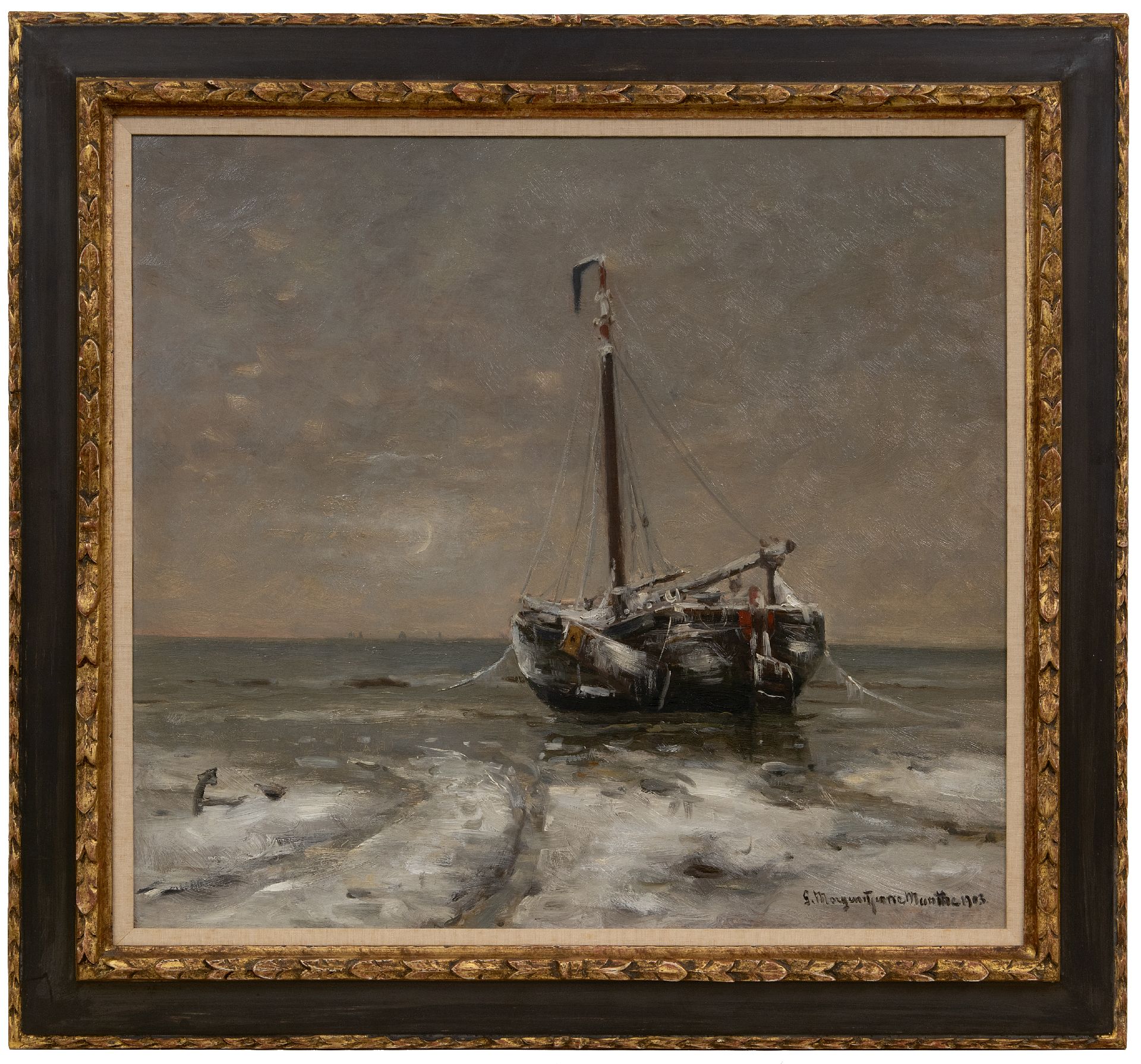 Morgenstjerne Munthe kunstwerk • schilderij • te koop Besneeuwd strand met bomschuit
