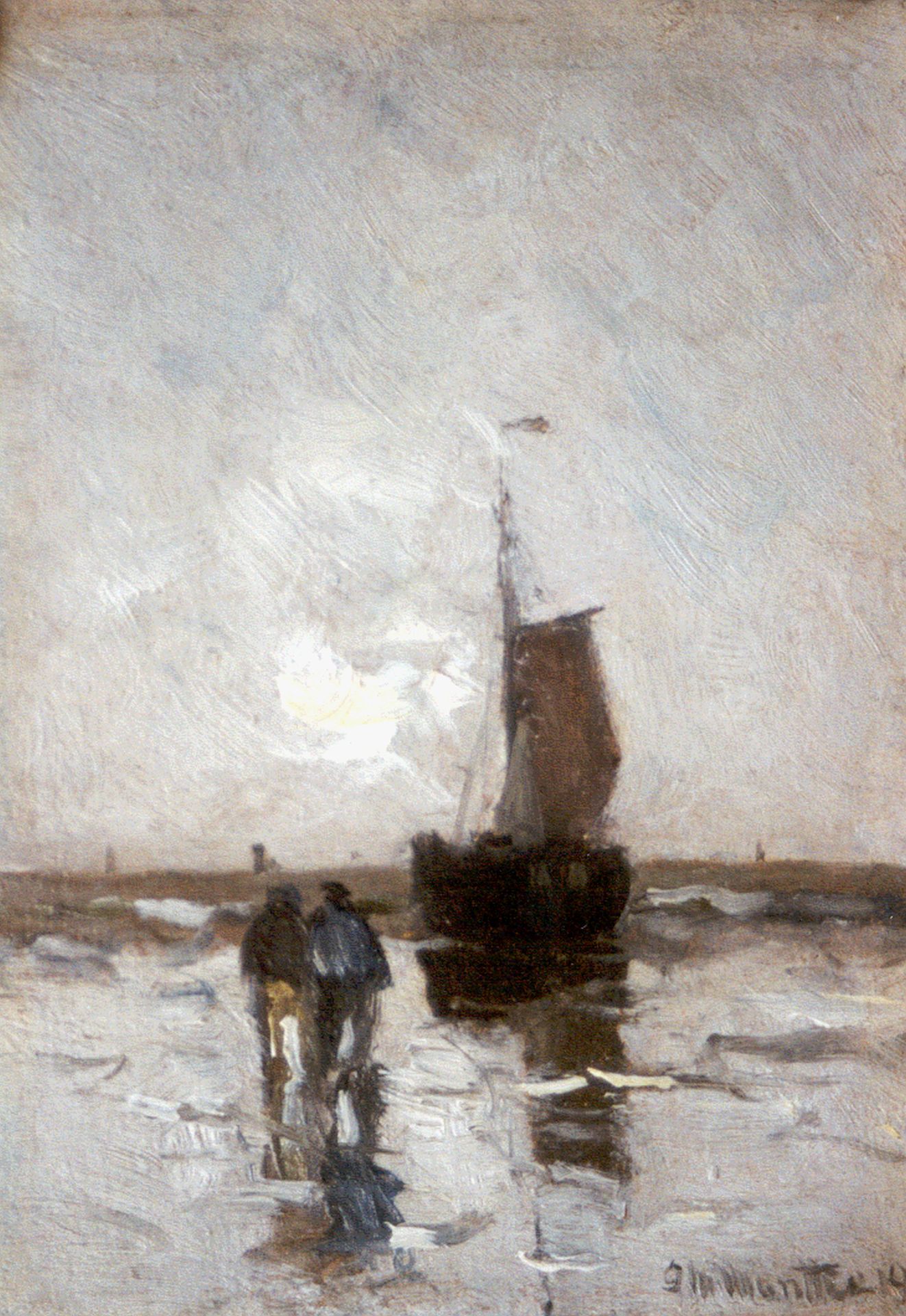 Morgenstjerne Munthe kunstwerk • schilderij • voorheen te koop Bomschuit en vissers op het strand