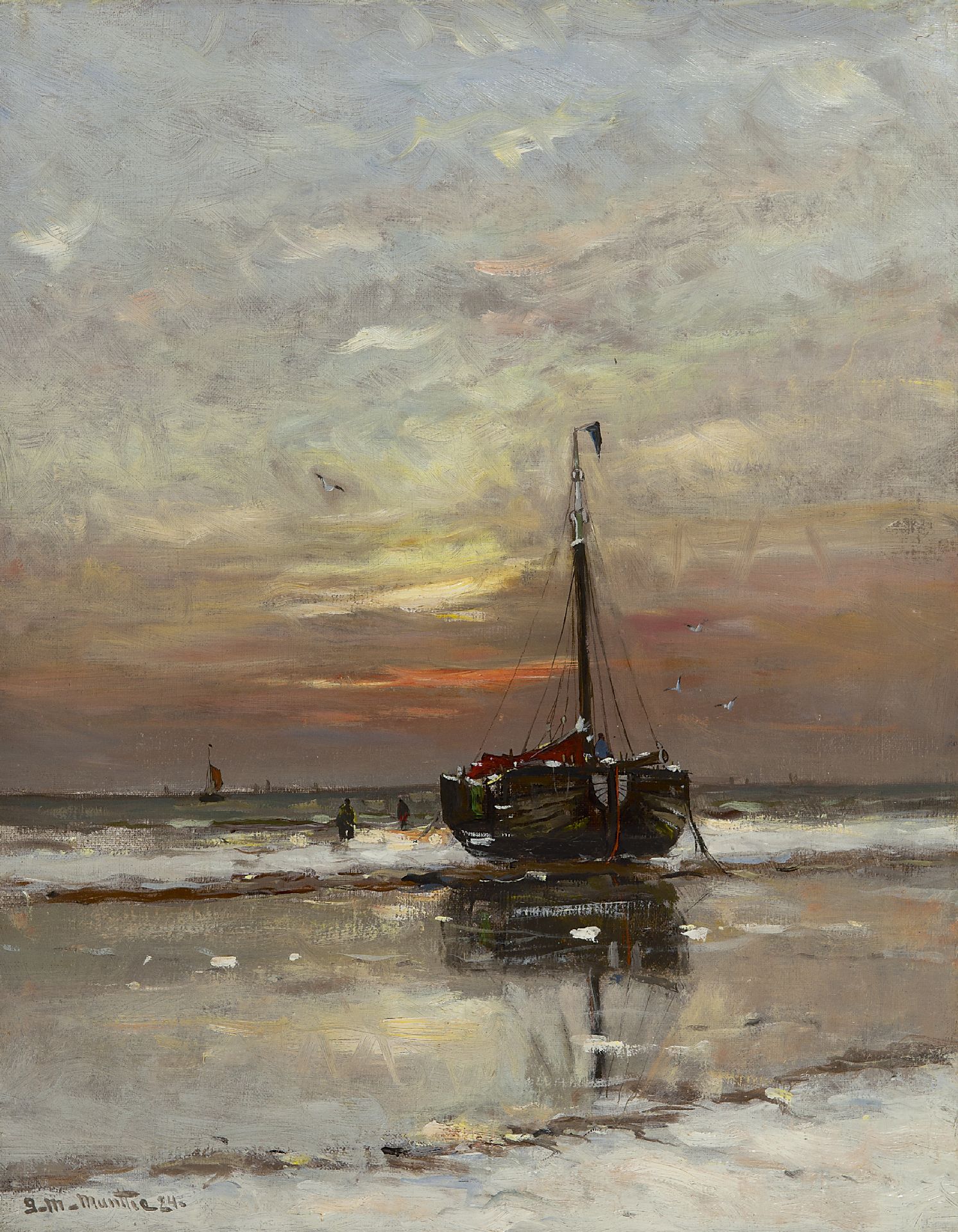Morgenstjerne Munthe kunstwerk • schilderij • voorheen te koop Bomschuit op het strand bij zonsondergang