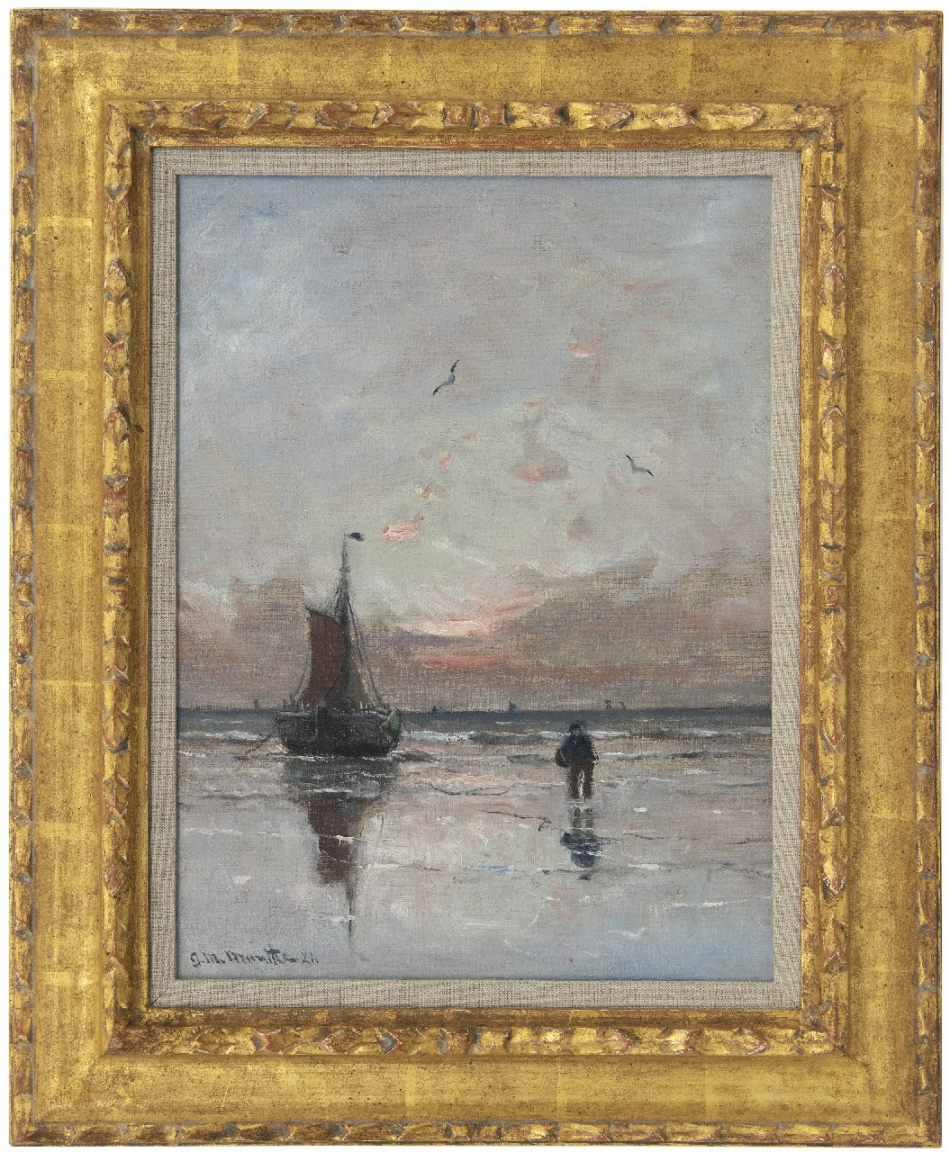 Morgenstjerne Munthe kunstwerk • schilderij • voorheen te koop Bomschuit voor anker bij zonsondergang